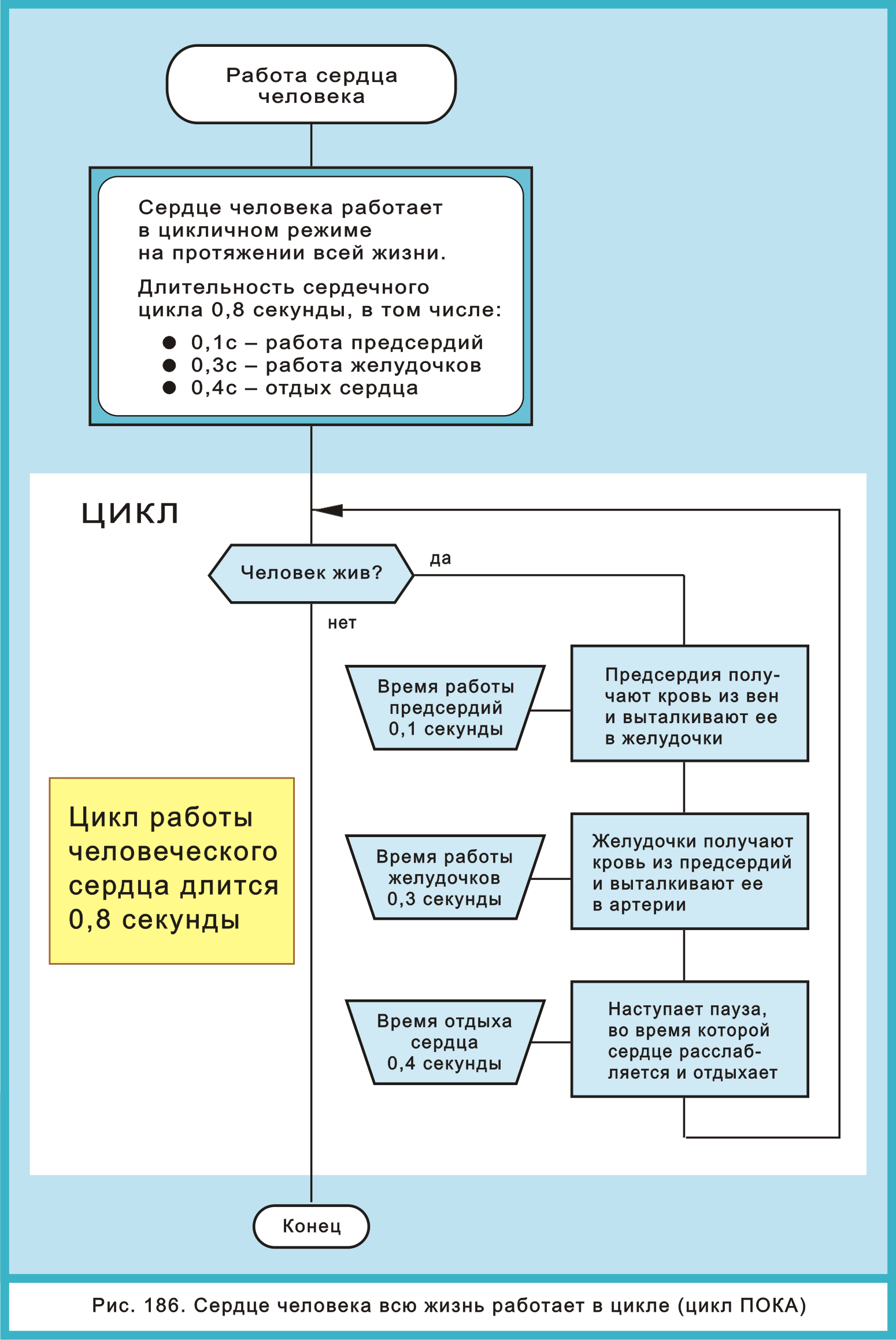 Работа сердца очень сложна. Поэтому мы выбрали лишь малую часть работы нашего главного насоса. И изобразили ее в виде упрощенного алгоритма (рис. 186).