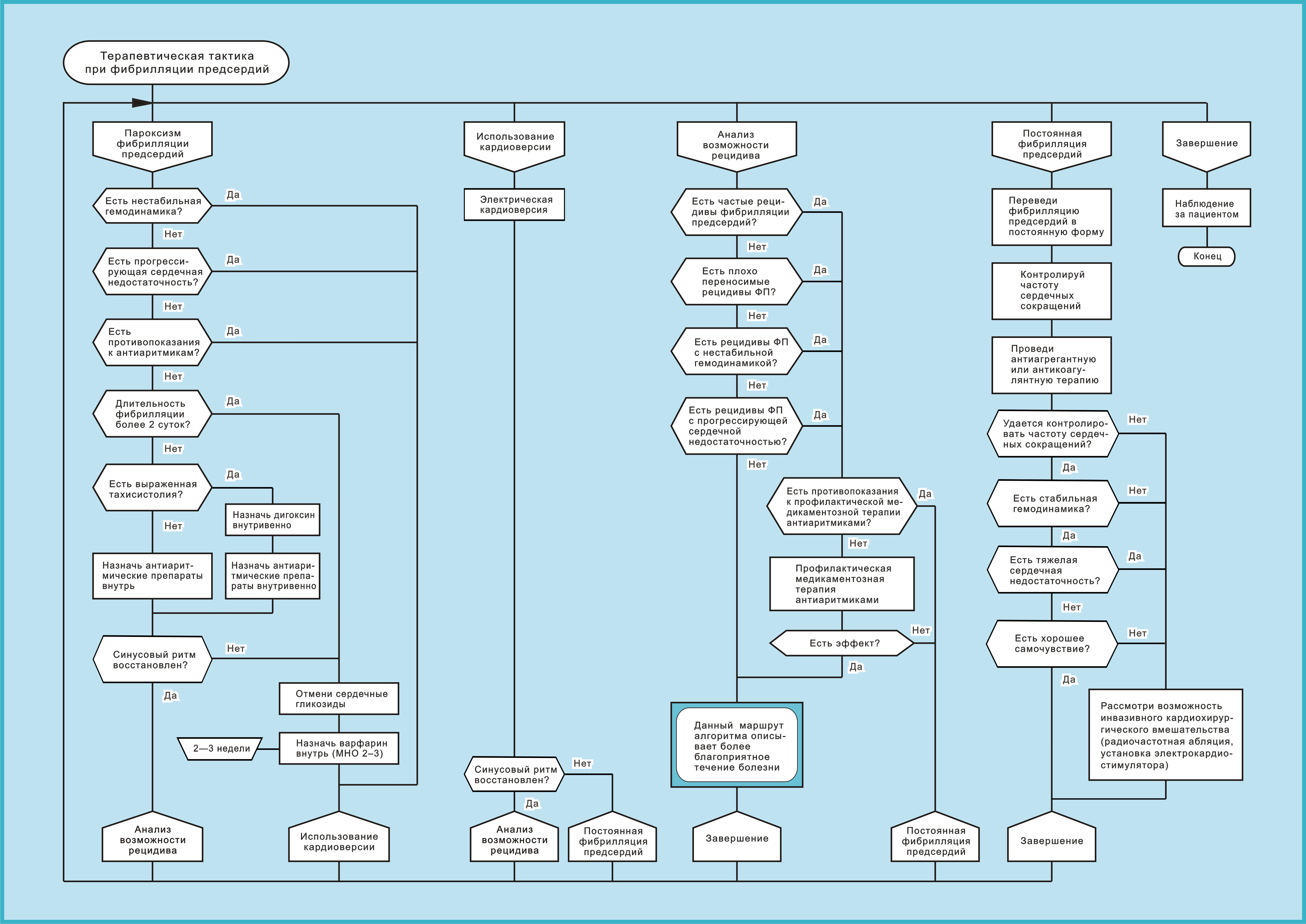 12. Указанный в пункте 9 удовлетворительный медицинский алгоритм "Терапевтическая тактика при фибрилляции предсердий" я превратил в дракон-схему (см. предыдущее сообщение).