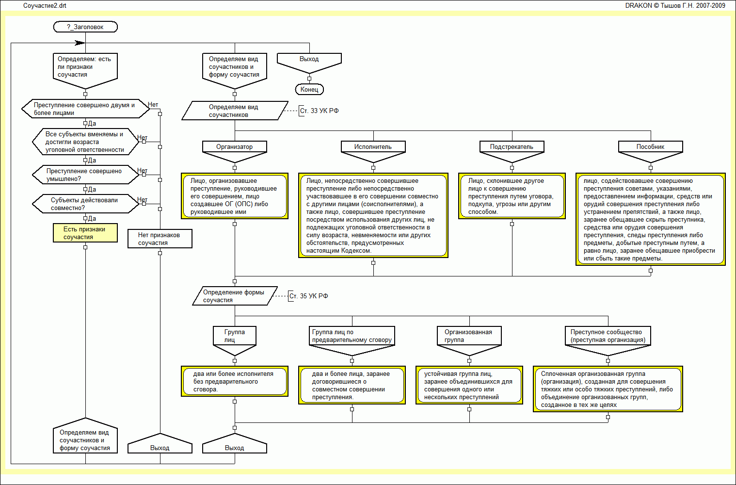 Уголовное право - т.н. материальная отрасль права, в ней говориться ЧТО ДЕЛАТЬ с лицом, совершившим преступление. А процедуру привлечения к ответственности, т.е. КАК СДЕЛАТЬ, определяет уголовный процесс. Поэтому, строго говоря, применение Дракон-схем не совсем корректно, т.к. они предназначены для описания процедур.