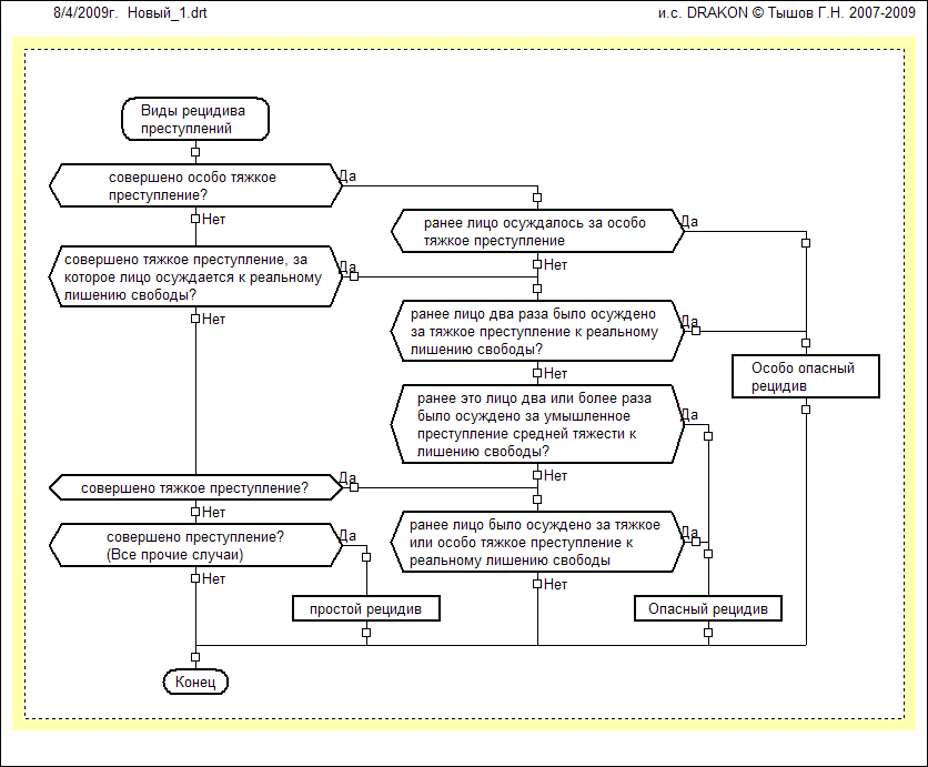 Схема Множественность преступлений.drt ветка "Рецидив преступлений" первая резвилка - судимость есть - рецидива нет? Там же - "Виды рецидива" - чем хуже тем правее "Особо опасный" хуже чем "Простой". Вообще мне кажется по шампуру стоит пускать самые простые "неопасные" случаи т.н. "Main flow" а вот отклонения направо и так до самого "Особо опасного"