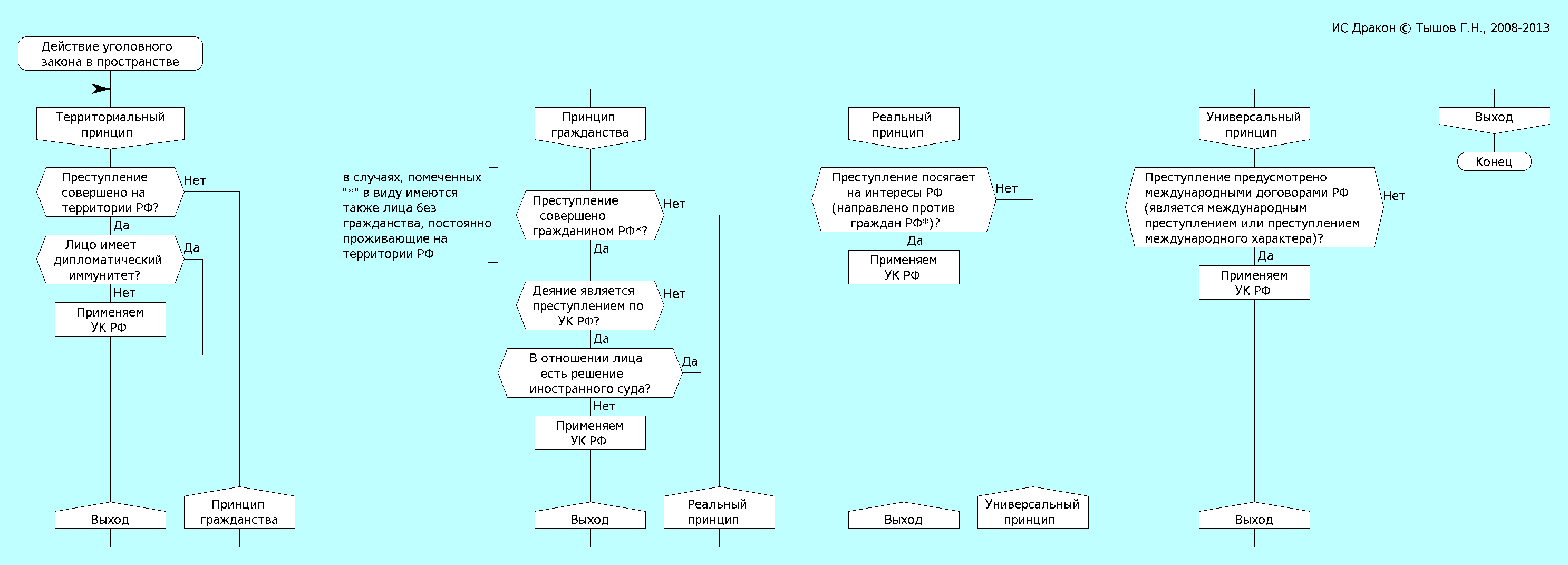 В приложении содержатся примеры ДРАКОН-схем по уголовному праву, подготовленных мною с учетом рекомендаций, полученных непосредственно от автора языка ДРАКОН, В.Д. Паронджанова.