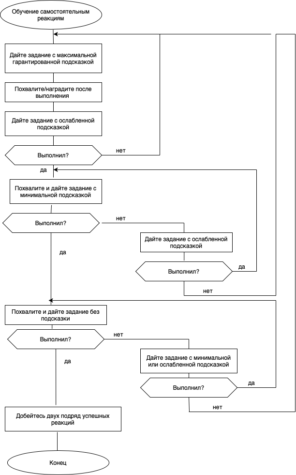 Сделал диаграмму для "Обучения самостоятельным реакциям" - https://drakonhub.com/ide/doc/comdiv/4 , оставив за рамками псевдо-шага "добейтесь двух подряд успешных реакций". Эта часть должна быть частью цикла, но требует прояснения.