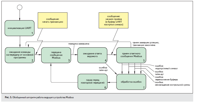 Только пока не совсем понял как Вы спрятали состояния "Передать сообщение" и "Приём сообщения" в другие состояния (в "Ожидания команды на передачу сообщения от основной программы" и "Ожидание ответа ведомого" соответственно).