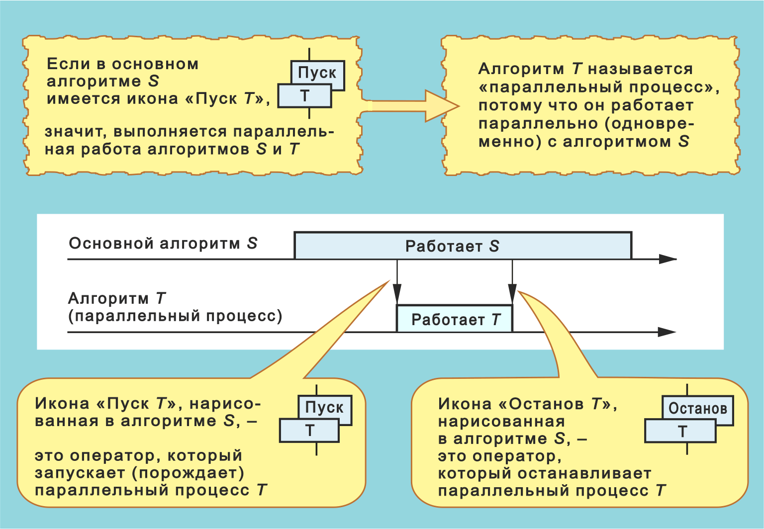 нет конкретики насчёт что есть "команда на запуск" и как она появляется. По-видимому, в модели исполнителя, всё-таки, предполагается не истинная параллельность. В противном случае, скорее всего, не было бы прямого доступа к разделяемым объектам/переменным и явно (согласно императивным принципам да ещё с необходимостью визуальных "метафор") задавались бы средства синхронизации/защитные секции и т.п.