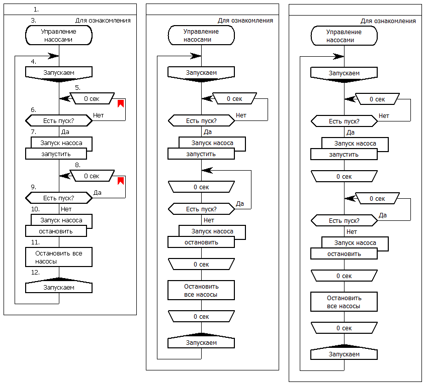 Насчёт второго цикла-ожидания (иконы 8-9). После "запустить запуск насоса" (икона 7, по-видимому, лишь устанавливающая атрибут активности для соответствующего процесса) в "вопросе" (икона 9) осуществляется доступ к ещё не изменённому значению флага, т.к. ещё не было исполнения смежных процессов. И тогда возникает очевидная лишняя проверка (перед уходом в икону "период").
