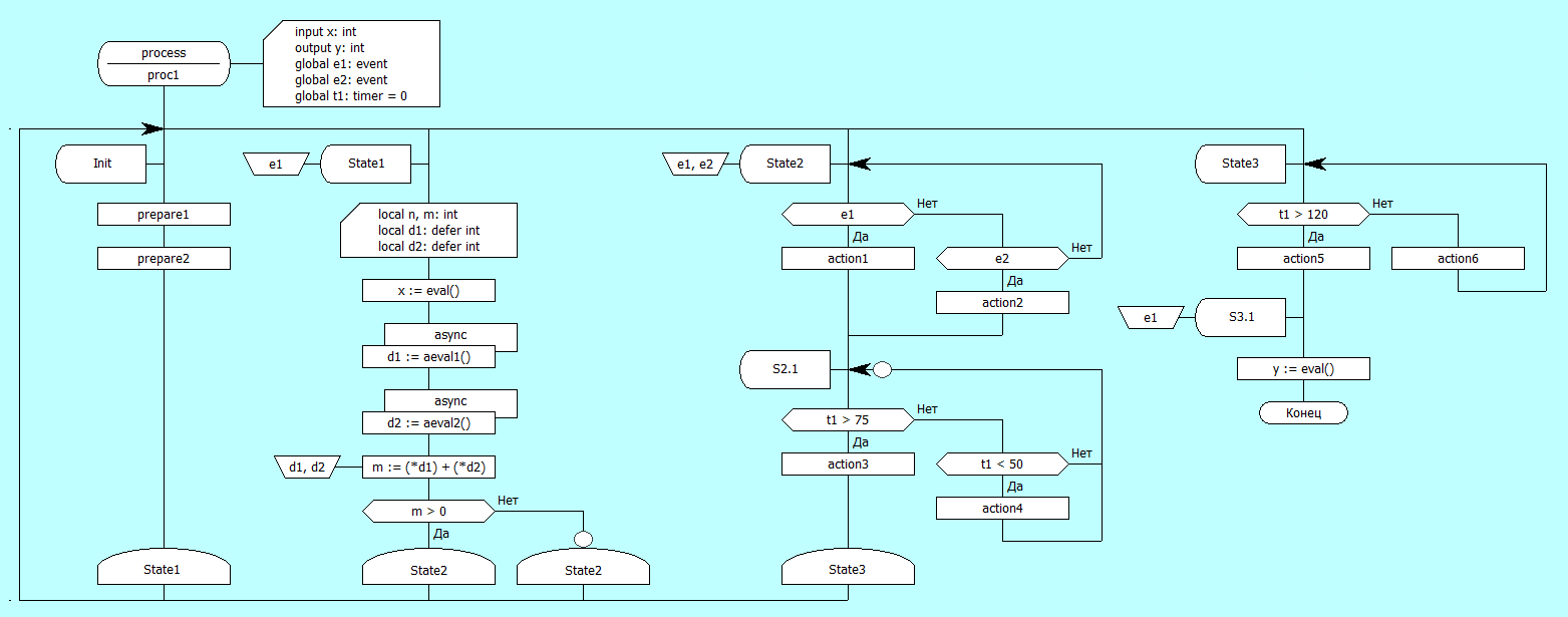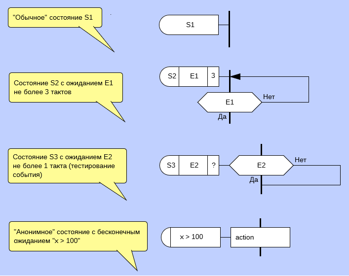 Да блин, мне, может, и интересно было бы придумать нотацию для "таймера с ожиданием и обработкой таймаута", но пока я склоняюсь к тому, что для таких случаев нужно создавать побочные Д-схемы, которые только и занимаются тем, что ждут таймаут, и полностью останавливают-перезапускают подконтрольные схемы. В таком случае особая нотация "с ведущим синхронизатором" не особо-то и нужна.