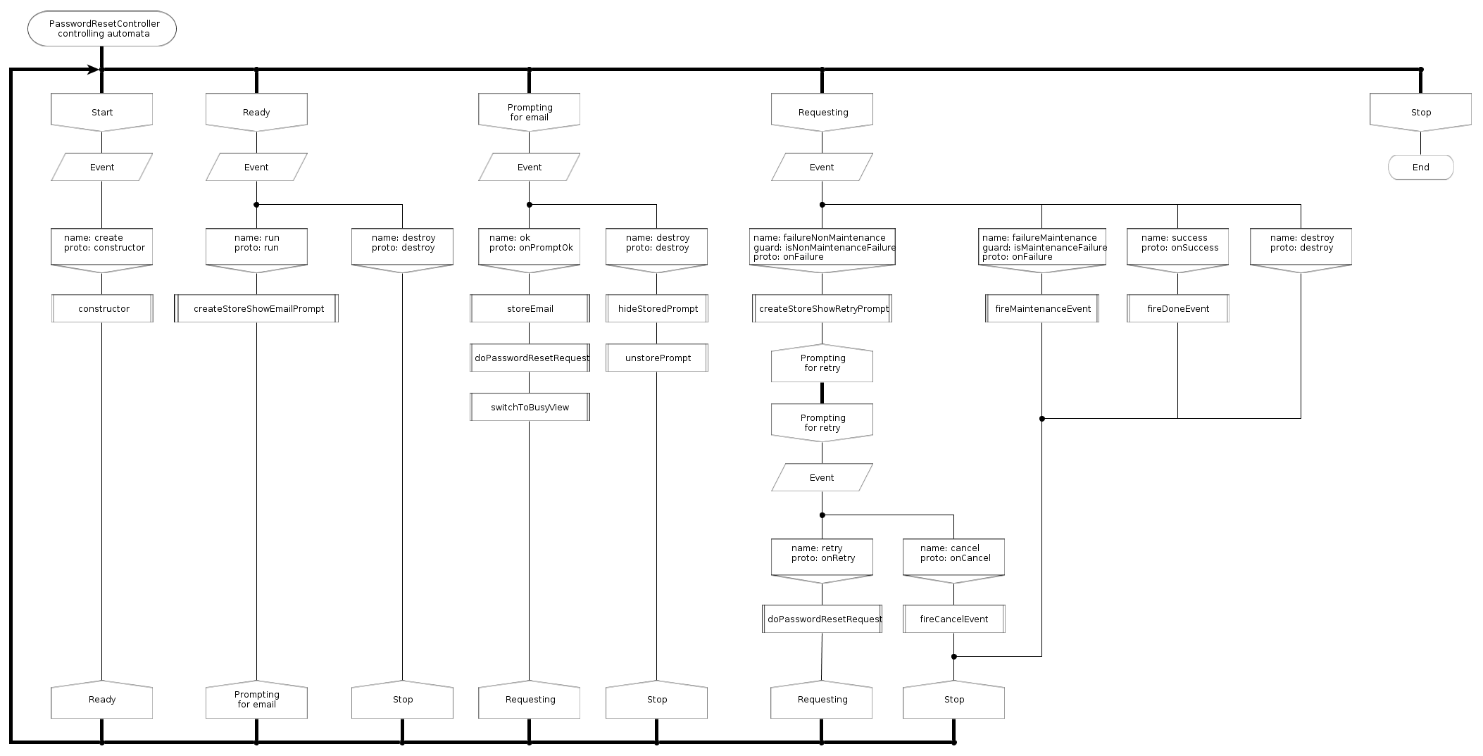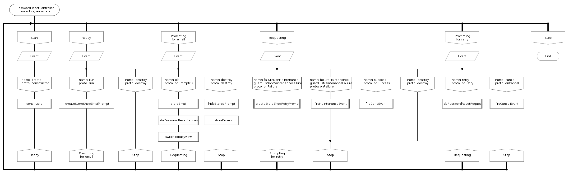 Например, в браузере достаточно сложно, иногда невозможно, сделать настоящий модальный диалог (если мы хотим чтобы приложение было одинаково совместимо со всеми браузерами), и допустим у нас выполняется некий асинхронный XHR (XmlHttpRequest) запрос к серверу, во время запроса, наш вид (V в MVC) мирно показывает индикатор выполнения запроса, и вдруг сервер "отвалился" (у пользователя кратковременно пропала связь с сетью), в таком случае контроллер, у меня, показывает модальное сообщение: "дескать нет соединения с сервером, не желает ли пользователь запрос повторить?". Пользователь в свою очередь может либо нажать кнопку "Повторить", либо "Отменить" операцию. При успешном завершении или отмене операции вид переключается в изначальное состояние, показывает какую нибудь форму ввода данных вместо индикатора выполнения запроса. Здесь - ожидание выполнения запроса сервером, и показывание предупреждения пользователю - два разных состояния контроллера. Пример диаграммы для контроллера формы сброса пароля пользователя дан ниже.