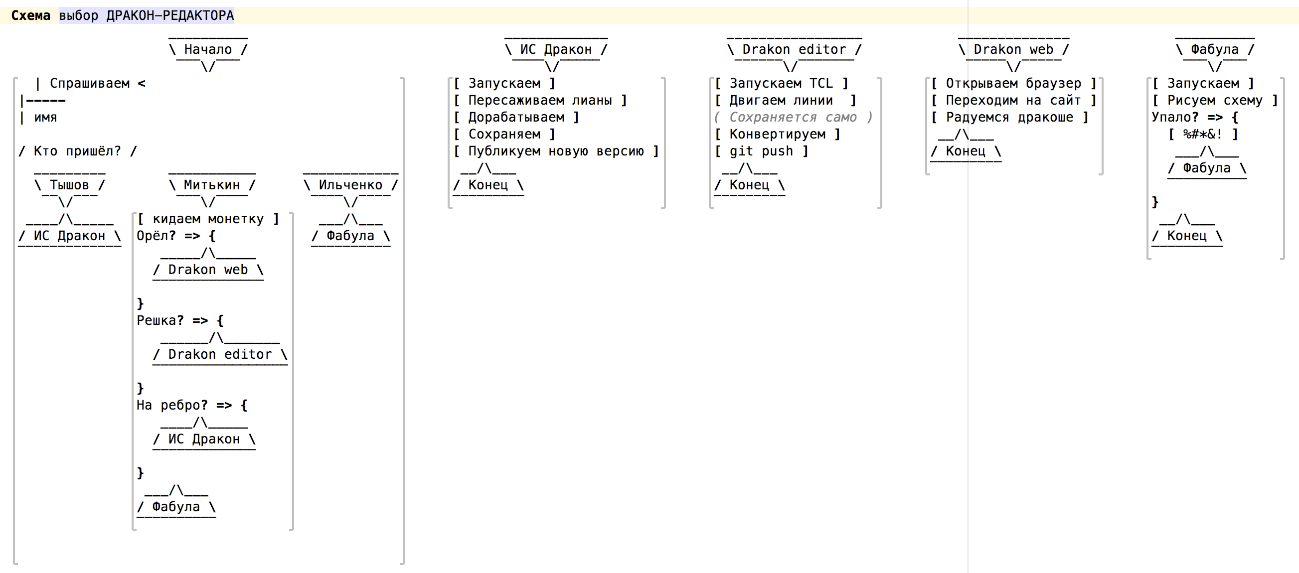 Фактически в голове благодаря ДРАКОН-схеме формируется сам процесс выполнения алгоритма,