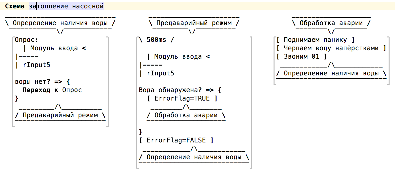 2) Причины, что алгоритм именно такой. Иными словами, Д-схема отвечает на вопрос "каким образом мы решаем задачу", но она не отвечает на вопросы "а зачем здесь понадобилась такая-то проверка" или "а почему эти два действия выполняются именно в таком порядке, а не наоборот". Всегда есть требования (например "запуск мотора должен выполняться при нажатом тормозе"), и по-хорошему, в программе должны быть отсылки к этим требованиям.