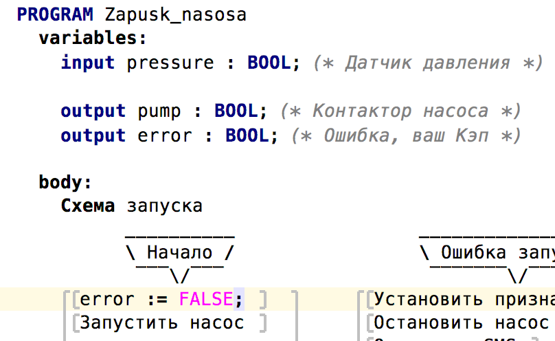 Например, "задача про насосы", вроде несложно разложилась в Ты-среде и основное время ушло на придумывание того "где же должен заканчиваться цикл", "а должен ли быть экземпляр процесса управления насосом единственный или по одному экземпляру на насос" ну и на борьбу со средой. Но, конечно, остался осадочек от того, что "непонятно в какой переменной сохраняется номер фактически работающего насоса" (т.е. из основного процесса приходится выключать все, либо как-то объявлять переменные -- ну и начнётся та же лабуда что в 61131 c VAR_INPUT, VAR_OUTPUT и т.п.).