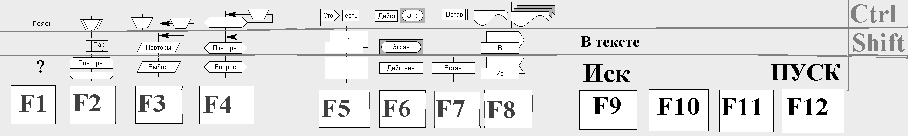 . В МОЁМ ВАРИАНТЕ все фигуры добавляются функциональными клавишами (F1...F8). Причем нажать такую клавишу можно, когда фокус на точке ввода, на фигуре (тогда новая фигура добавляется после неё) или даже в окне текста (тогда добавляестя после той фигуры, к которой относится это текстовое окно). То есть, нажал F6 (добавилось действие), сразу же написал текст действия; тут же, не прикасаясь к мышке, нажал F4 (добавился вопрос), пишешь вопрос и т.д. Кроме того, основные пункты скопированы прямо в строку меню (а в отдельном подменю - все остальные пункты), так что можно и к клавиатуре не прикасаться, а строить голую схему мышкой.
