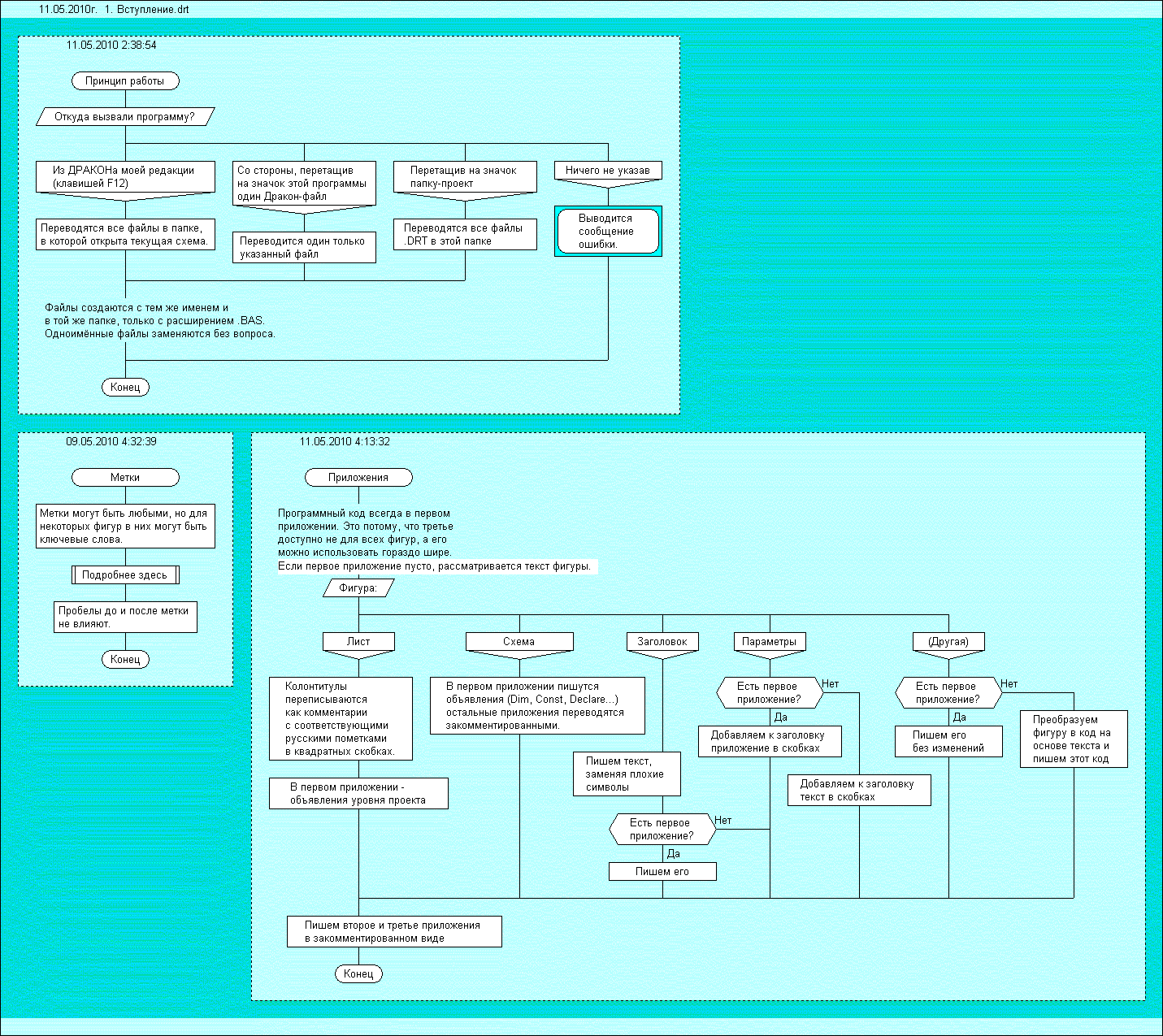 Вот, навалял такой переводчик Дракон-схем в код Visual Basic. Сначала я написал простенький переводчик, и только собрался публиковать - смотрю, а Геннадий Николаевич уже добавил примерно такой же прямо в и.с. Пришлось далеть помощнее. Я старался как можно меньше использовать слова Goto. Преимущества: