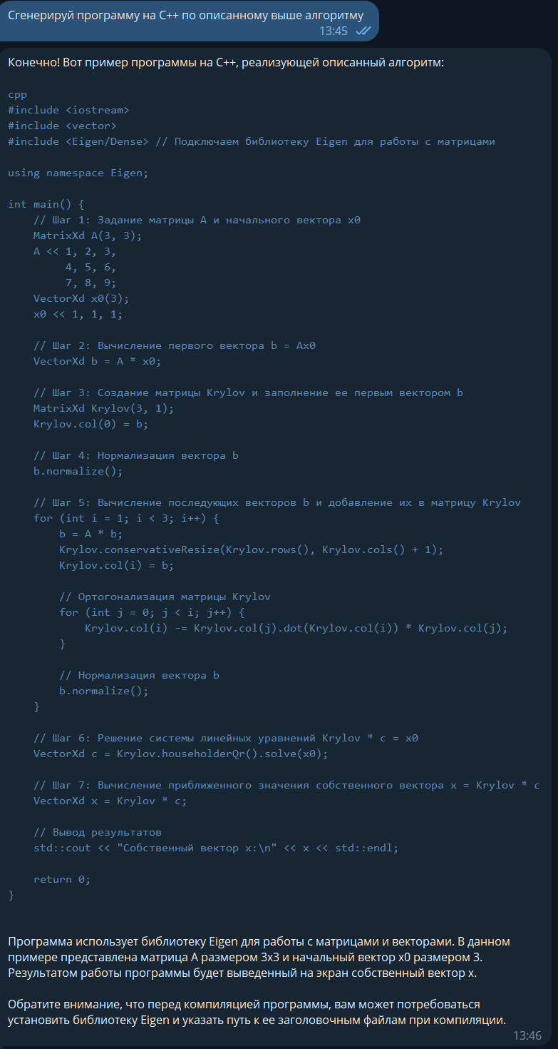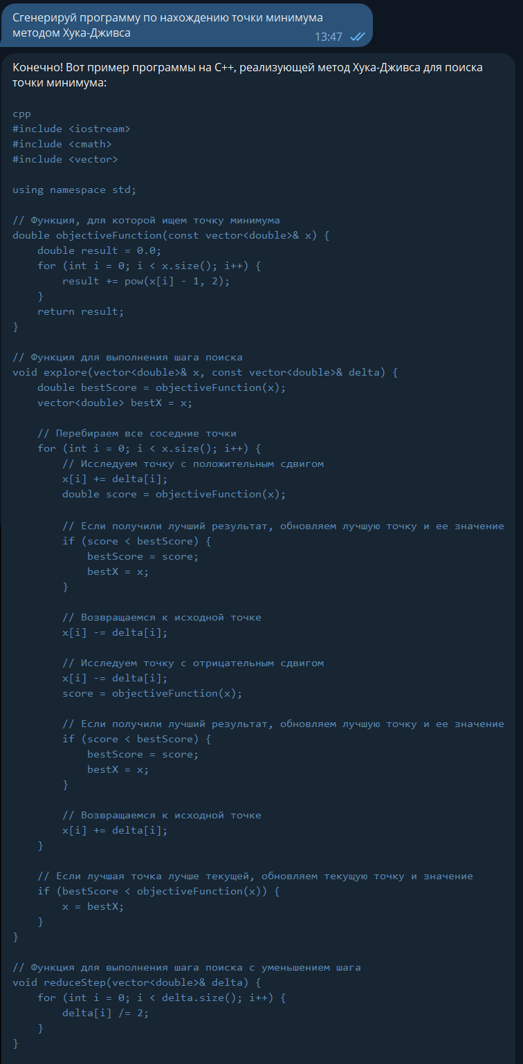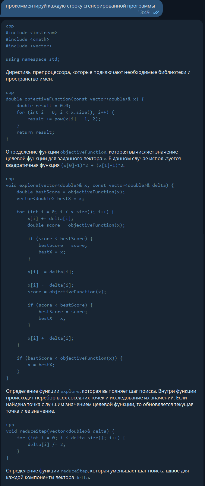 2. Теперь обсудим Ваше решение. Для этого сравним альтернативы. Например, почему бы пользователю сначала не написать "опиши алгоритм решения задачи: (задача)" а потом написать "сгенерируй программу на (язык программирования) по описанному ранее алгоритму" ?? Это первая альтернатива. Вторая альтернатива - попросить у нейросети комментарий к каждой строке сгенерированной программы. Это ведь достойные альтернативы.