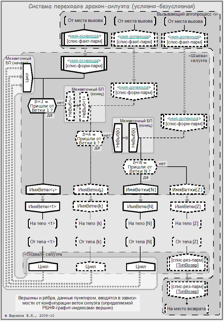 1. На "классическом" ДРАКОНе изобразить эти схемы невозможно (даже если искусственно "приравнять" БПВ-виопы к виопам обычного БП (Имя ветки, Адрес ветки) - что, однако, не будет эргономично) - в нём нет средств определения останова (ессно, можно просто написать "Останов" вместо "Конец" :) - но по правилам он всё равно д.б. единственным... и имеет свой смысл - см. ниже).