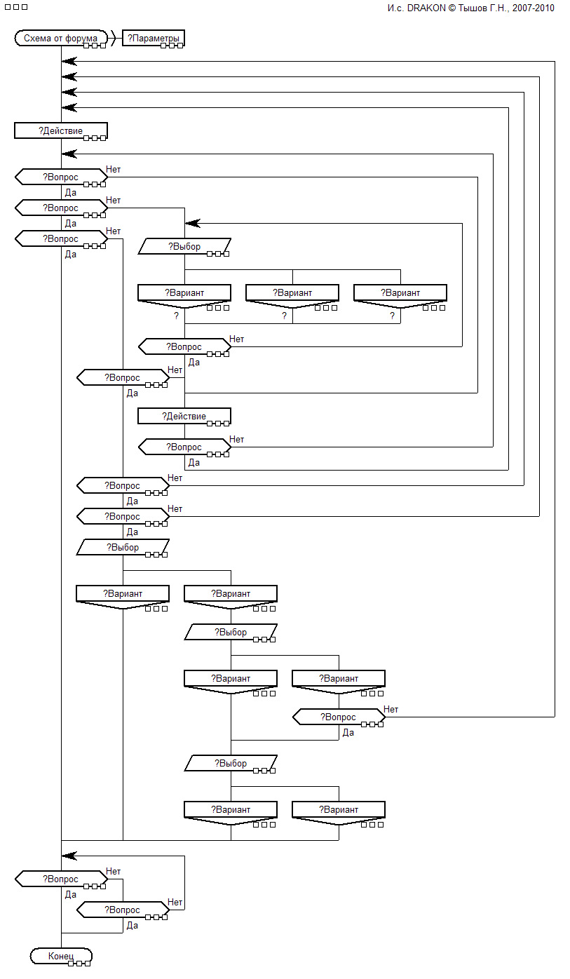 На ДРАКОНЕ запутанный и непонятный алгоритм нарисовать просто нельзя. И наоборот, любой сложный алгоритм, нарисованный согласно этим правилам, становится очень понятным.