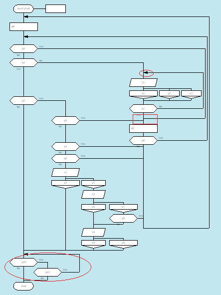 И, чтоб не забыть, отмечу прямоугольником побочный вход в цикл. Тут я не могу доказать однозначно неправильность алгоритма, но это грубая ошибка.