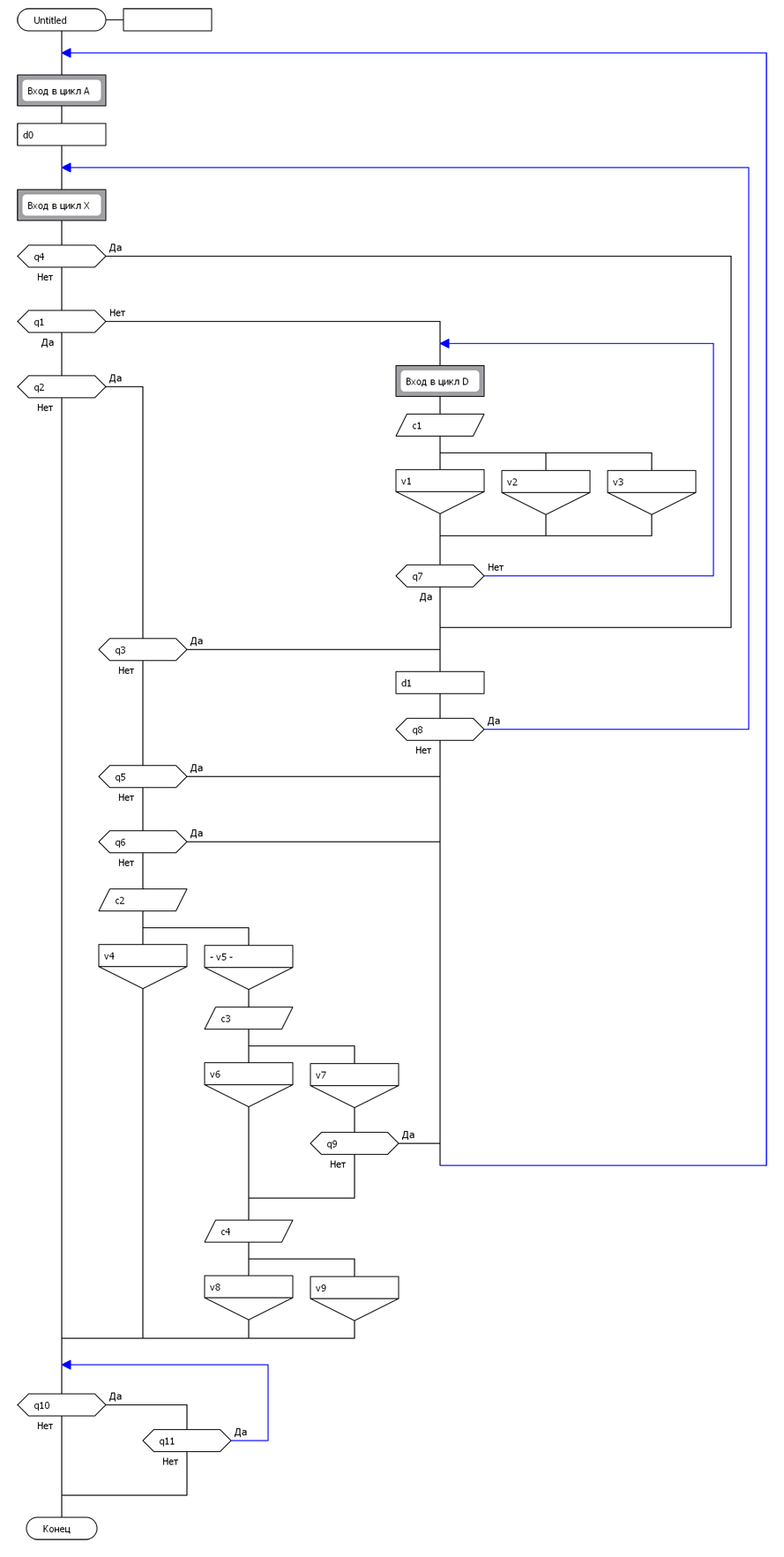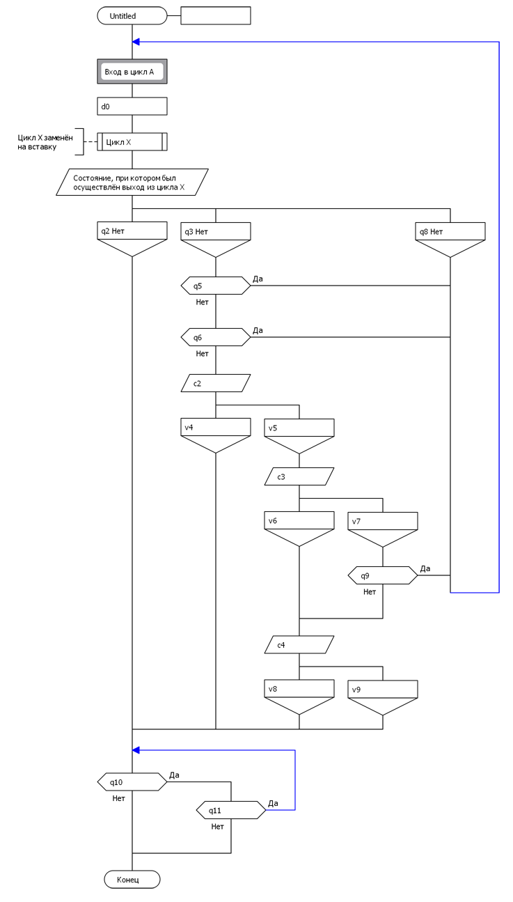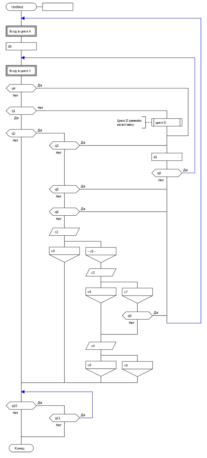 Ответ: Т.к. мы исходим из того, что в развилках только проверяются логотношения между величинами, фигурирующими в шампур-блоках ветвей, то при исполнении такой конструкции будет происходить следующее. После прохода ненагруженной вертикали состояние визуала не изменится (мы ведь ничего не делали для этого) и произойдёт возврат в начало цикла Дейкстры. При дальнейшем выборе состояние опять не изменится, следовательно, исполнитель придёт к той же вертикали. Легко видеть, что произошло "зацикливание". Если ненагружены несколько вертикалей, то "зациклится" самая левая из них (ближняя к шампуру).