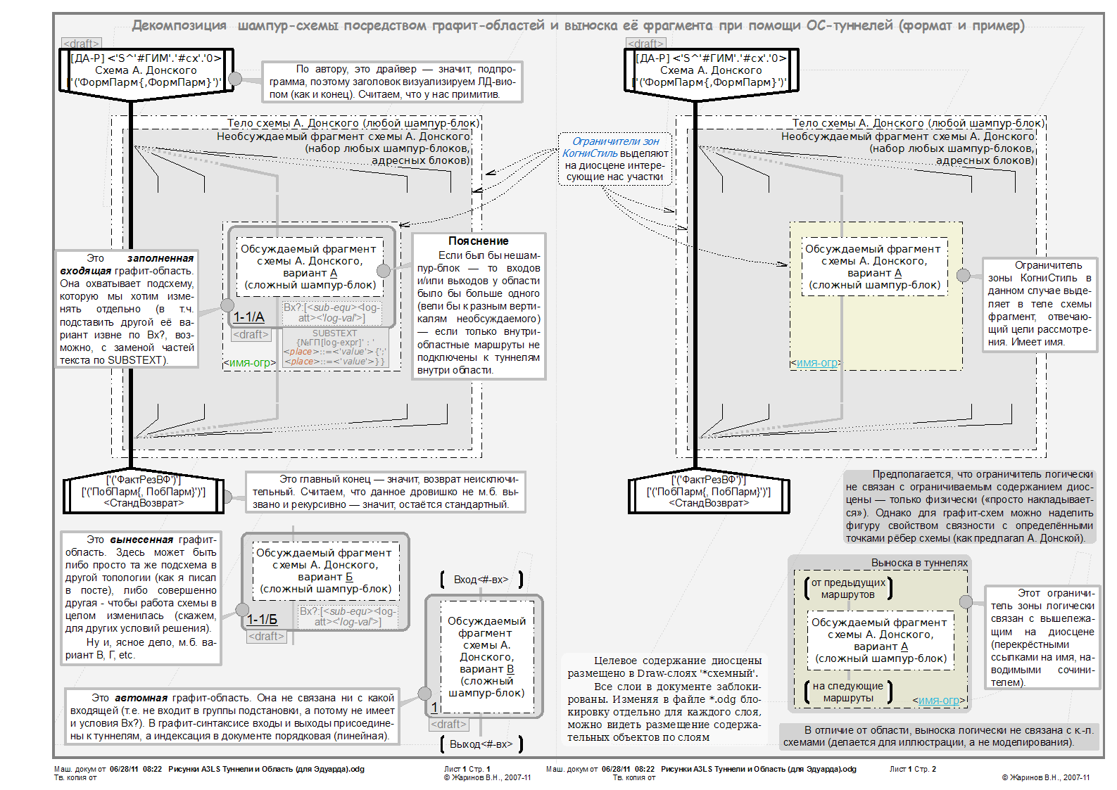 P.P.S. Взял больший формат и разделил способы. Видно, что автономная область отличается от выноски отсутствием атрибуции статуса сочинения. А кроме того, любая вынесенная область - элемент своеобразного каталога вариантов (палетты) для оперативного подключения к любой модели (в т.ч. из другого документа). Выноска же делается всегда в том же документе и частью модели не является - м.б. связана только по ссылке с ограничителем, который указал сочинитель - в общем, в терминах IDEF, это "схема FEO".