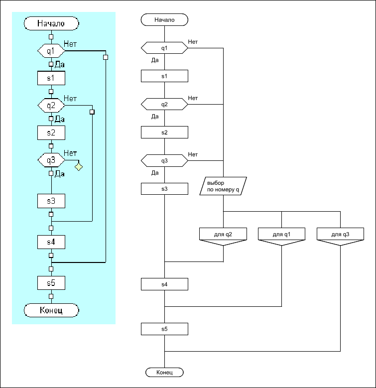 Естественно, редактор не позволяет сделать такой финт. Но можно преобразовать блок-схему, тогда это станет возможным (справа):