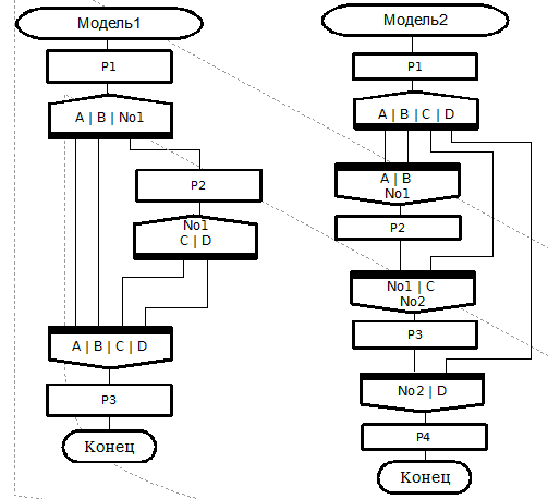 Похоже, что для восприятия эти обозначения не лишние. И кстати, именно в примитиве наводят на некоторые размышления. Например, можно ли одно из равноправных направлений следования после расщепления (а равно и перед сбором) показывать стрелкой, а другое (то, что по вертикали) - нет? Здесь ведь нет главного маршрута. И так же, получается, будет в силуэте? И это расщепления только на два шампура... Как-то вид ГОСТ-овских узлов (я опять же отвлекаюсь от их смысла в ГОСТе - мы можем дать свой) эргономичнее... но тоже не идеал из-за неинформативности - на схеме д.б. все необходимые сведения по её дальнейшей детализации (и "сколько потоков программить", и что вообще нужно делать)...
