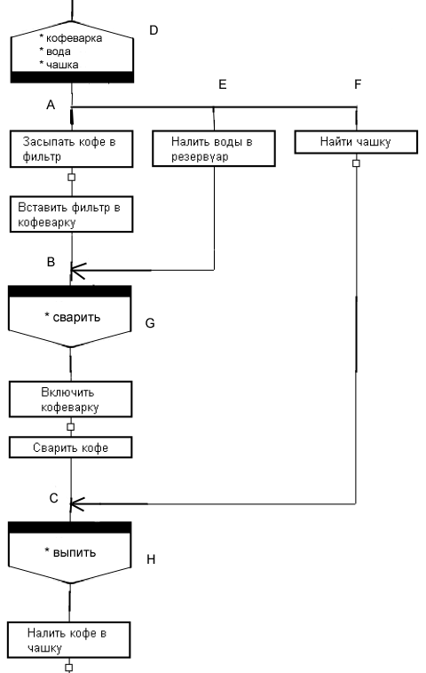 Маркер узла расщепления говорит о том, что здесь находится точка распараллеливания процессов и называются эти процессы «кофеварка», «вода» и «чашка». Действует правило: в маркере имена процессов, идущие сверху-вниз, соответстуют визуальному изображению процессов слева-направо от узла расщепления. При разворачивании в силуэт каждый процесс получит своё «Имя ветки».