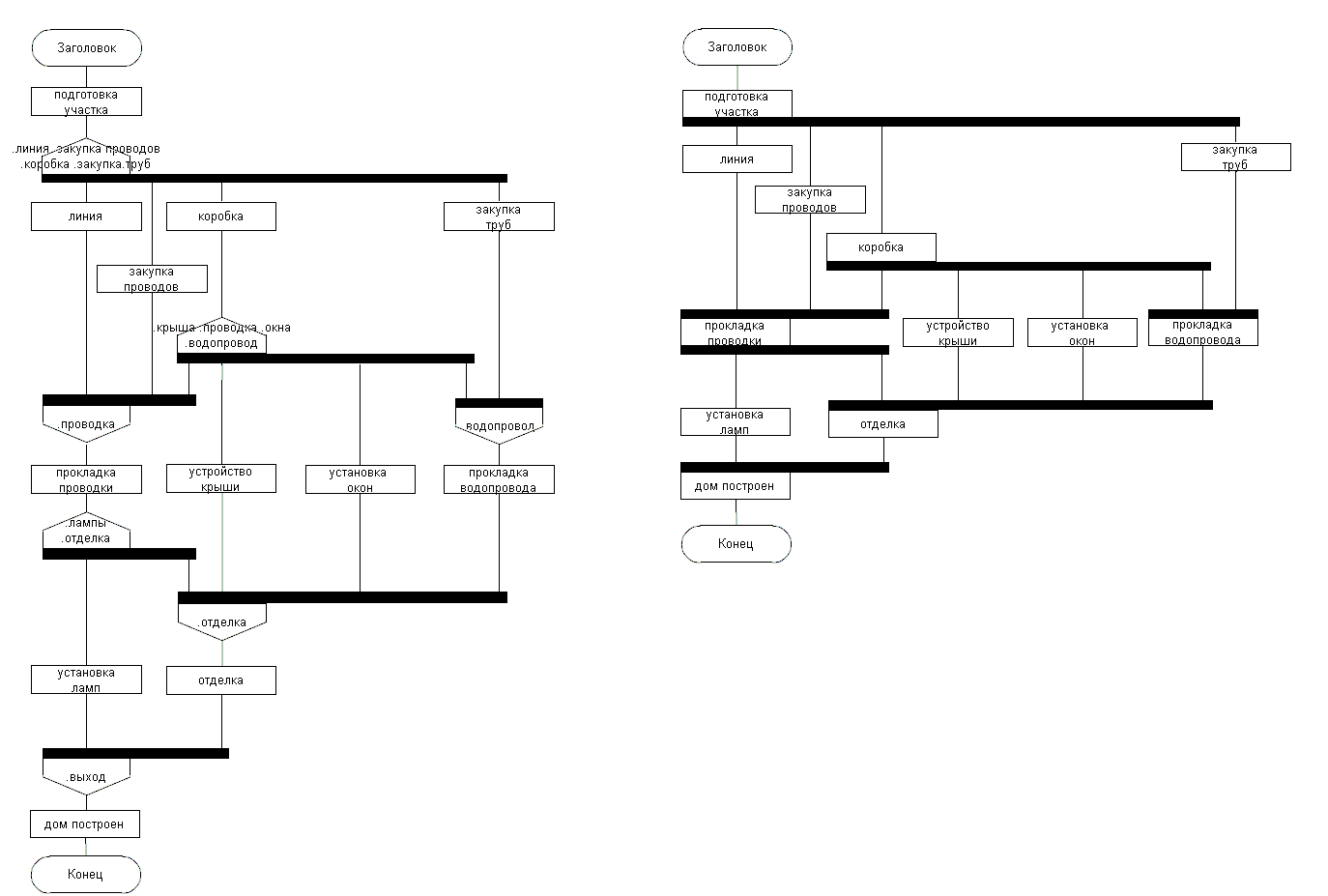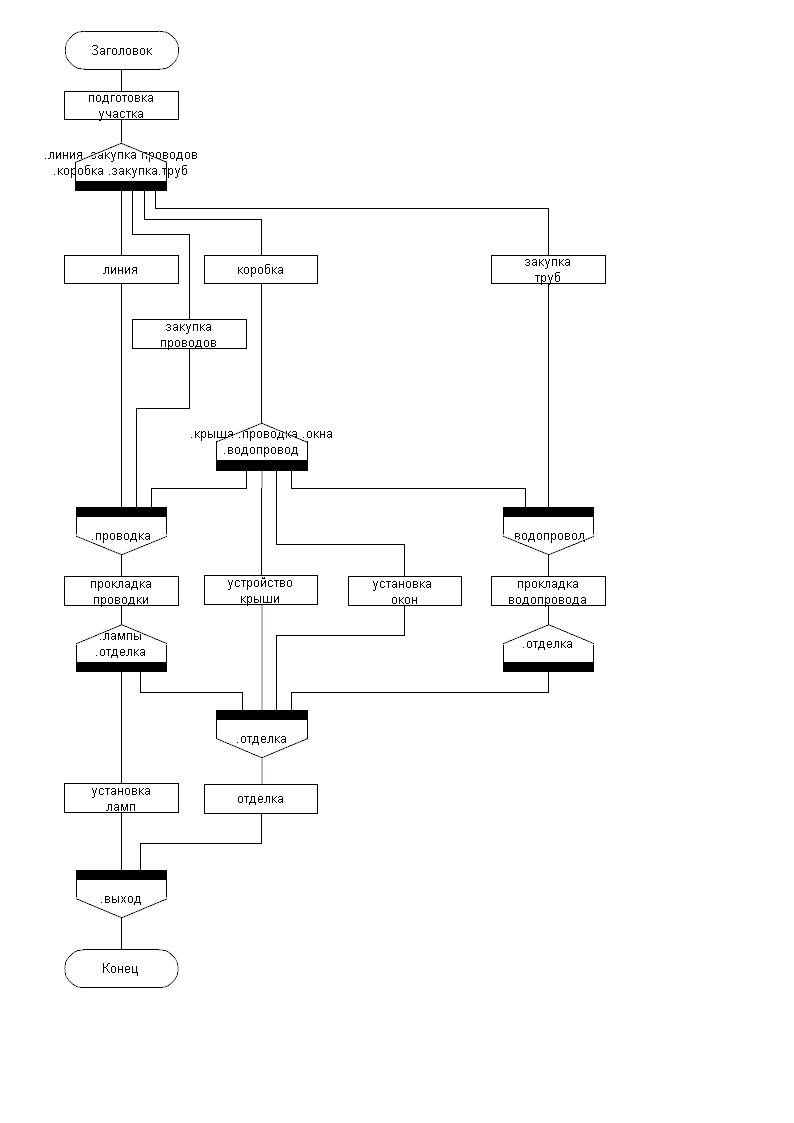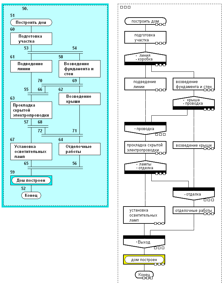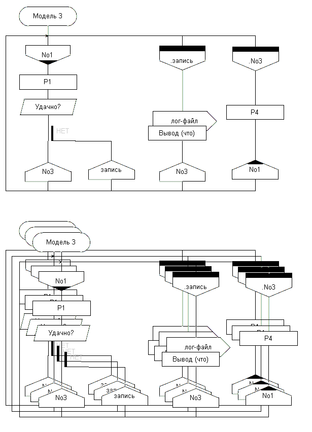 Ещё об "алгоритмической расшифровке" узлов. Узел расщепления в результате выдаёт последовательность сообщений И20 (далее тип сообщения буду указывать через дефис). При этом в его алгоритме вначале описывается (исходя из содержания иконы Узел расщепления) вычисление порядка старта шампуров, формирующее массивы: имён их процессов; количеств порождаемых копий (в частном случае равно единице); интервалов старта текущего шампура относительно предыдущего (для синхронного узла все равны нулю); реальных моментов старта шампуров (по единому времени; вначале все элементы нулевые); наборов параметров (включая формальные, если есть), размножаемых (возможно, с изменениями, также описываемыми изначально в иконе Узел расщепления) по числу копий; индекс массивов есть номер шампура по порядку старта. Далее повторяется по числу исходящих шампуров (следованием, а лучше как тело охватывающего цикла ДЛЯ по номеру шампура) конструкция следования из: цикла ЖДАТЬ, проверяющего доступность "своих" объектов (и исполнителей при ограничении на их доступность); иконы Пауза, берущей интервал старта "своего" шампура; цикла порождения копий, в теле которого идут: конструкция описания "захвата" набора параметров шампура; икона И20-Старт, в которой и имя процесса, и набор формальных параметров есть переменные-компоненты нужных массивов, выбираемые по индексу шампура ("параметризованное" сообщение процессу; вроде техноязыком допускается); икона Действие для записи реального момента старта текущего шампура в "свой" элемент массива (можно заменить её на Пуск таймера и тогда делать вместо паузы цикл порождения по таймеру с параметром (ПерТаймера[ПредШамп]+ИнтСтарта[ТекШамп]; или, если так можно, делать Пуск таймера текущего по ПерТаймера[ПредШамп], сравниваемой по "не меньше" с ИнтСтарта[ТекШамп]). Т.о. у нас заранее (до исполнения) определены "типы" шампуров как алгоритмы их процессов, а временнОй порядок следования типов и число экземпляров каждого типа определяются при исполнении (конечно, на схеме поведения эргономично упорядочить асинхронные шампуры в порядке старта, о чём уже говорилось); это указывается в тексте единичного поля узла расщепления. Если узлы расщепления каскадируются, то на шампуре текущего узла, идущем к следующему узлу расщепления, стартует его визуал (все узлы имеют уникальные имена, назначаемые и их алгоритмам) сразу; неясно, можно ли допускать вставку между ними ещё и целевого процесса - ведь его работу обычно ещё надо контролировать.