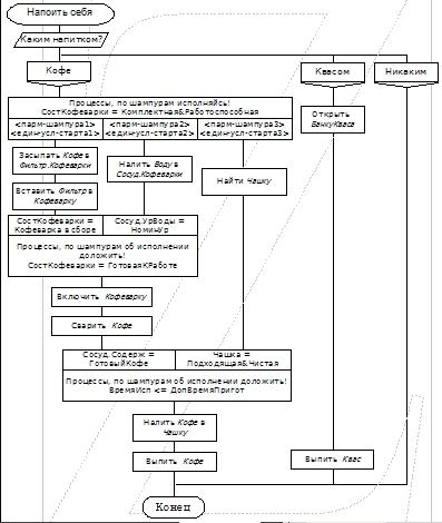 P.P.S. Корректируются также узлы для общего случая, изменил определения базового смысла с учётом сказанного выше. Также имена в точечной записи должны означать свойства объектов (не везде соблюдал). Нарисовал схему поведения в форме силуэта, правда, для такой схемы это построение надуманное. Кстати, мои извинения Эдуарду: его переключатель также допустим, просто в нём пересажена лиана "Квас"; а мой вариант имел целью показать употребление каждого напитка