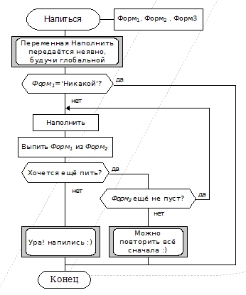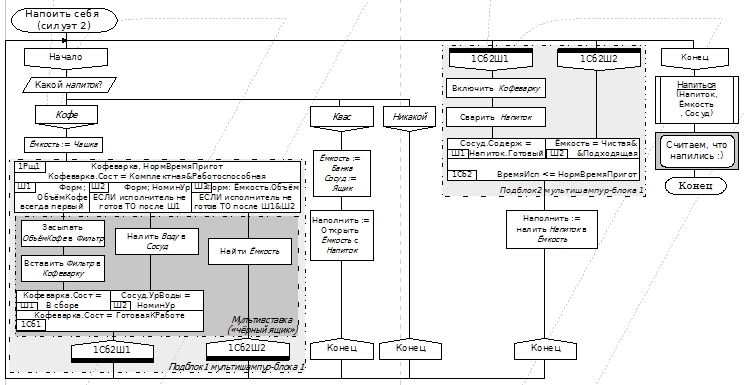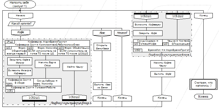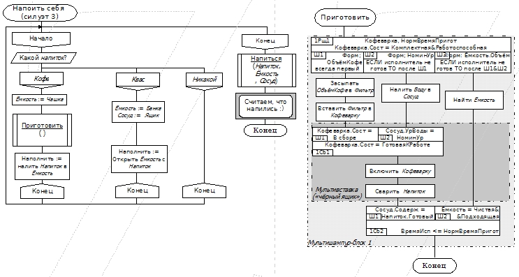 Реализовал отделение в дракон-МШ-модели МШ-схем от дракон-схем для варианта 2 как вариант 3 (кстати, исправил ошибку в логике визуала Напиться: не было алгоритмизовано, что делать, если Напиток='Никакой'); подредактировал и остальные варианты. Наверное, допустимо и так и этак; лишь бы укладываться в формат диосцены. Также обозначил своё понимание использования оператора "чёрный ящик" от Рэйлвей Каген: им сочинитель временно обозначает часть мультишампура, содержание которой пока не знает (на разных МШ-схемах для примера поставил по-разному). Кстати, комментарий "Можно повторить всё сначала" - намёк на рекурсию в МШ-схемах (в данном случае - взаимную); но её допустимость здесь надо ещё проверить...