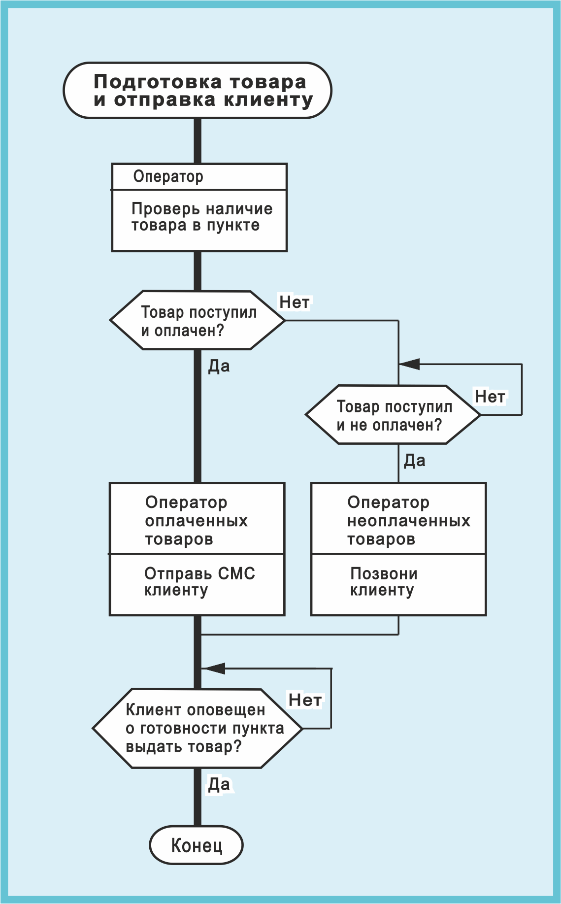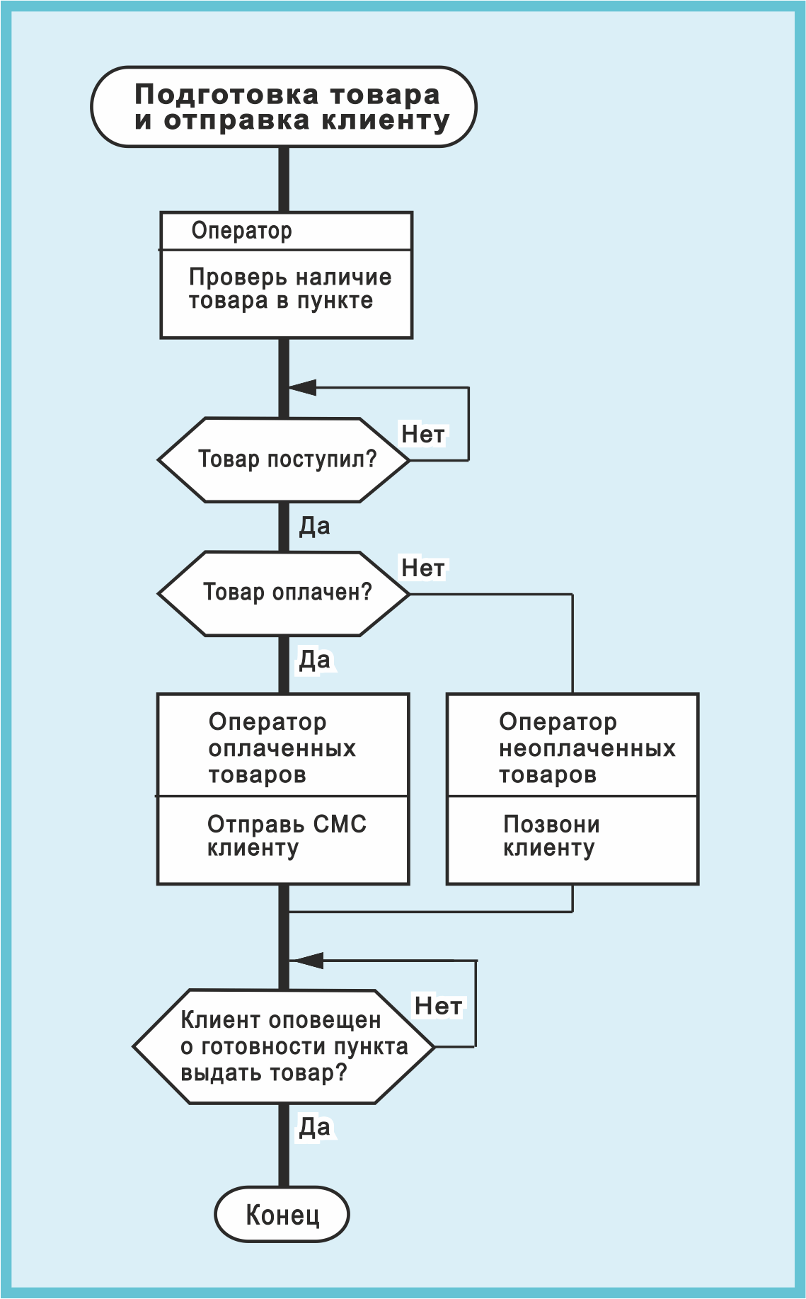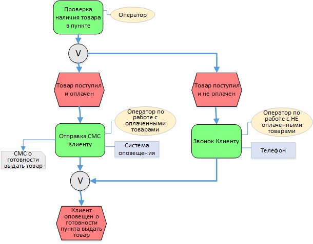 Поэтому сложное логическое условие "Товар поступил и оплачен?" заменено на два простых логических условия: