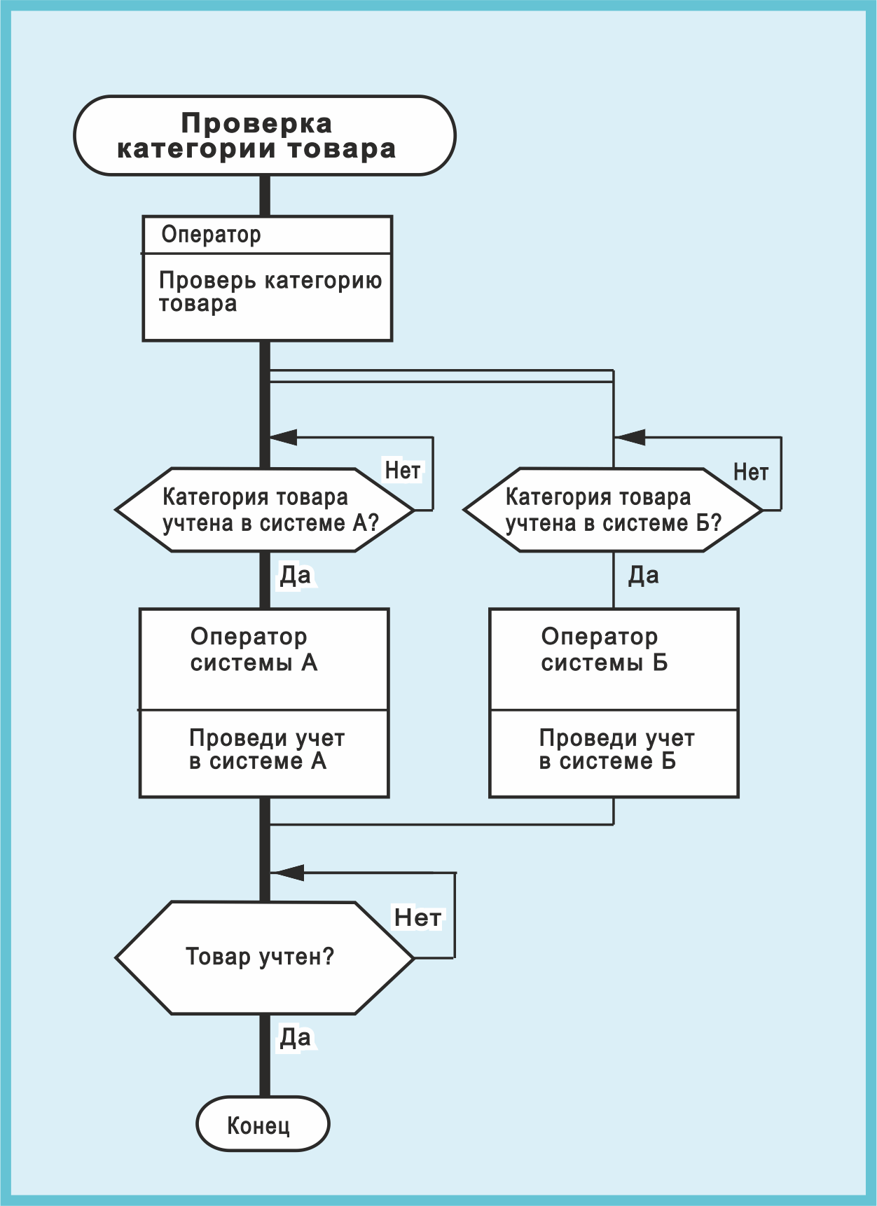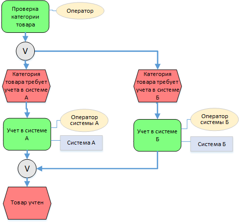 Странно, почему тогда на выходе «Проведи учет в системе Б» использована не двойная, а одинарная линия? Ведь если процесс был вначале параллельный, то почему он стал в конце другим?