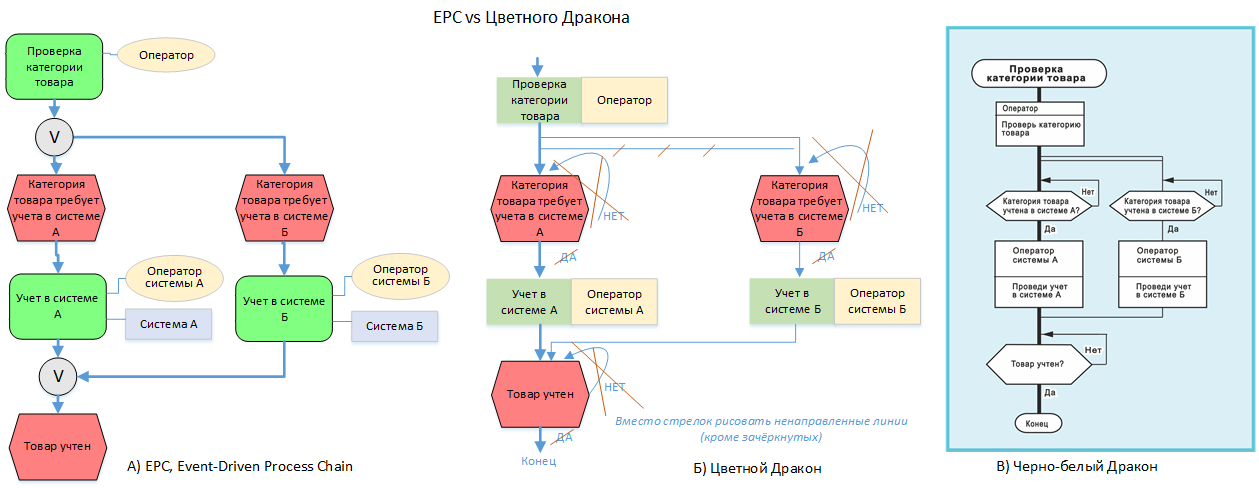 На рис. «ЕРС vs Цветного Дракона» показана раскраска и смещение блока с Исполнителем вправо. Если показать эту схему знатоку нотации ЕРС, то он и не будет сомневаться что ее рисовали как ЕРС, только немного «криво» (торопясь), например, вместо правого желтого овала (Роль) отрисовали прямоугольник, а у зеленого прямоугольника забыли скруглить края (Функция). Примитив "событие" - по форме идентичный (шестиугольник).