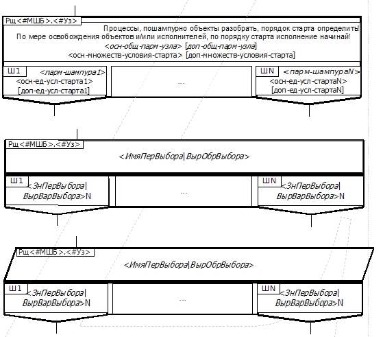 Вообще полагаю, чисто визуальная декомпозиция возможна и в данном случае - если, следуя Вашему же МШ-алфавиту, рассматривать как икону "чёрный ящик" только "крупный" узел... тогда как в Ты-среде на иконе Вставка щёлкаем на нём - и открывается детальная схема (при начале сочинения - пустая, только мигрируют концы шампуров, как в логике IDEF-методов). Далее по мультишампур-методу каскадируем её.