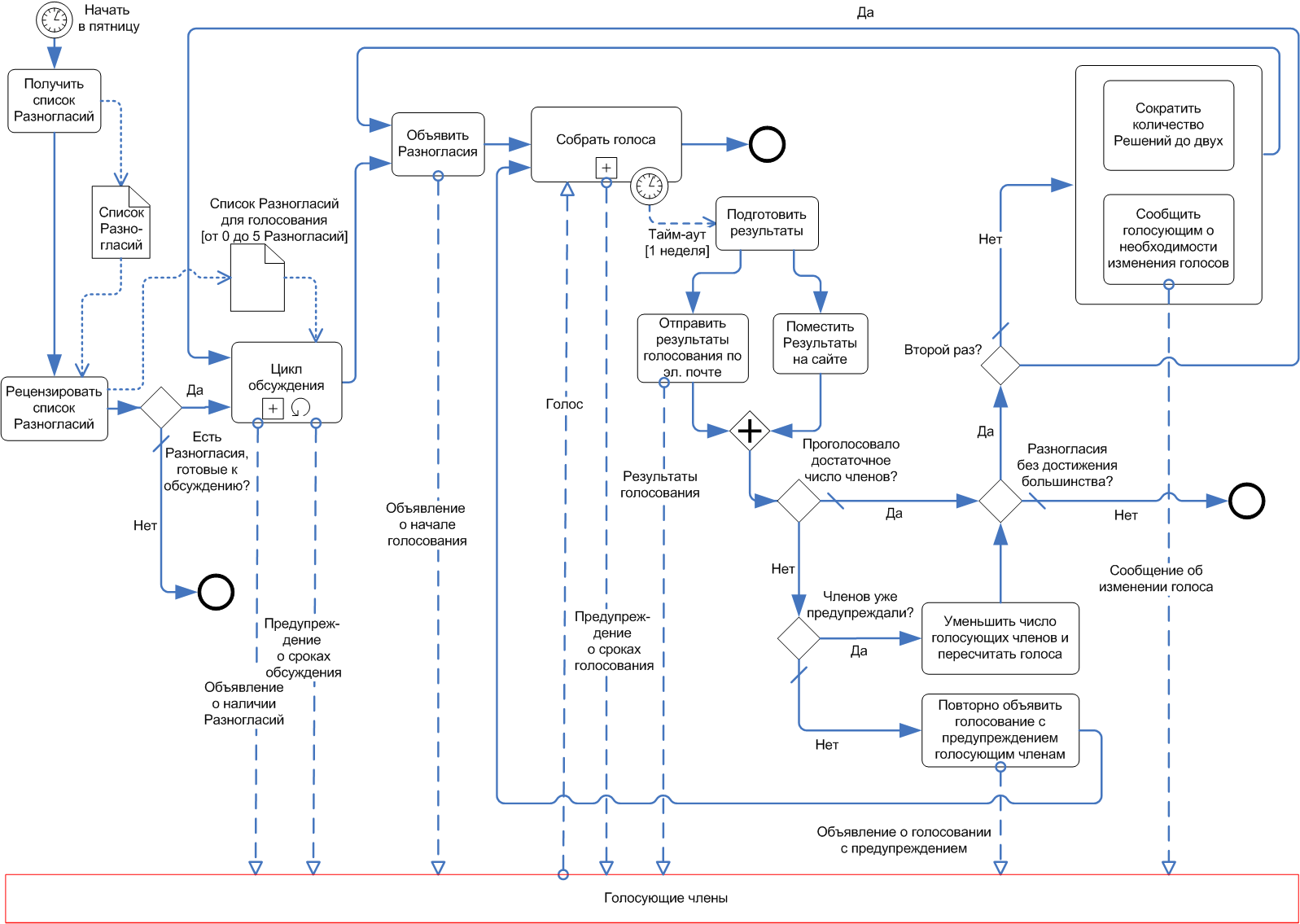 Спецификация BPMN - это книга размером в триста страниц, которая просто заполнена графическими иллюстрациями её применения с подробными комментариями: всего около 130 рисунков! Кроме того, спецификация содержит подробный пример описания завершённого и реального процесса: процесса разрешения разногласий с помощью голосования по электронной почте (см. Рис. 1). Это процесс, который реально работал в организации BPMI при разработке самой спецификации.