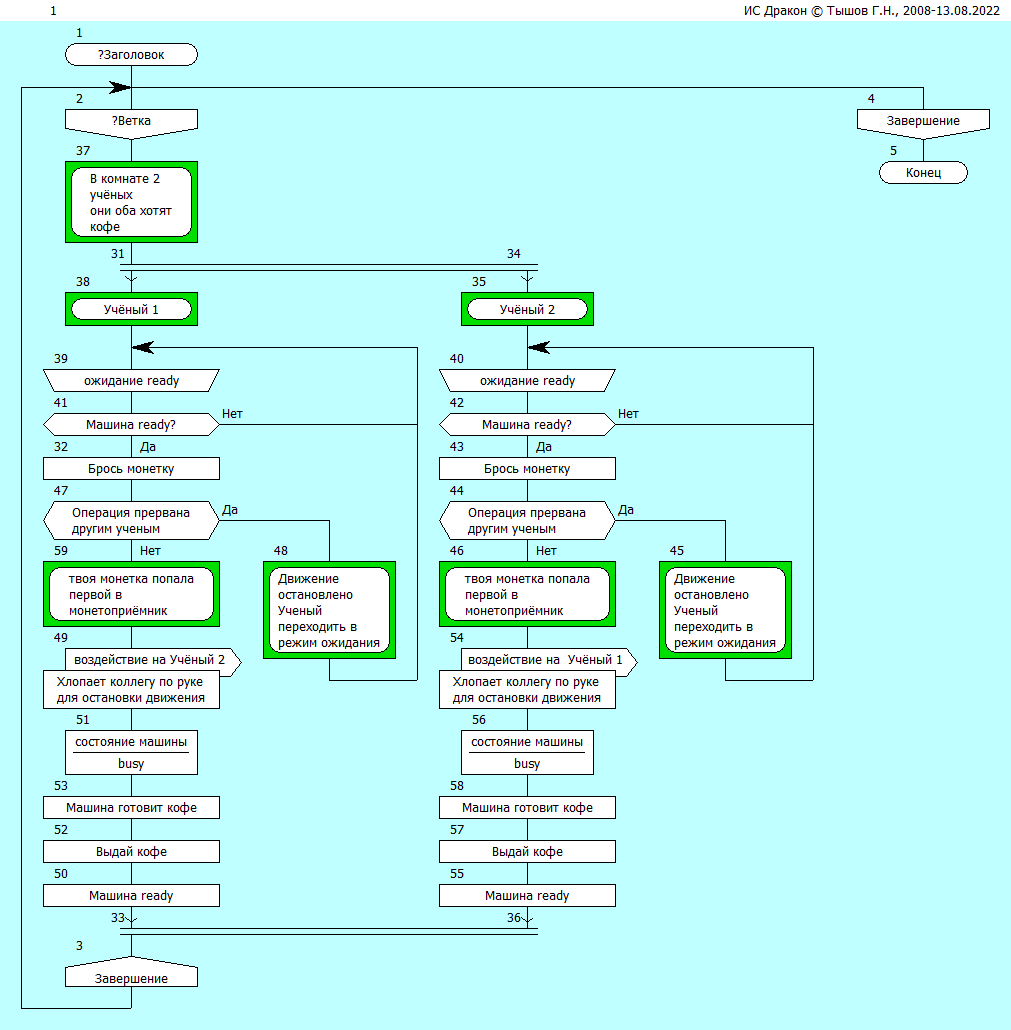 Привет! Спасибо за такой подробный пример — это реально помогает сразу вникнуть в суть задачи. Я попробовал спроектировать твой вариант 4 (антимаркер из WF2M) на ДРАКОНе: получились две параллельные ветки, где каждый учёный, прежде чем бросать монету, проверяет готовность машины, а потом (если оба попытались почти одновременно) выясняется, кто был первый. Первый переходит в busy, второй — без всяких сложных «антимаркеров» или cancel-дуг просто уходит обратно в ожидание. По сути, вся конфликтная ситуация тут предотвращается заранее за счёт простого ветвления и явных проверок.