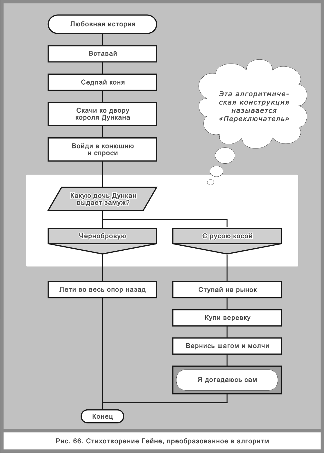 Это стихотворение легко превращается в алгоритм (рис. 66). Там же виден «кусочек» декларативного знания, которое записано в иконе комментарий — «Я догадаюсь сам» (рис. 66).