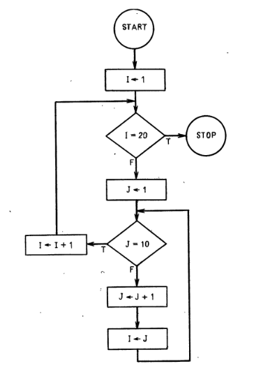 Здесь представлено два цикла, которые "пересекаются". Данную блок-схему можно изобразить и в виде силуэта (к сожалению, нет времени это делать).