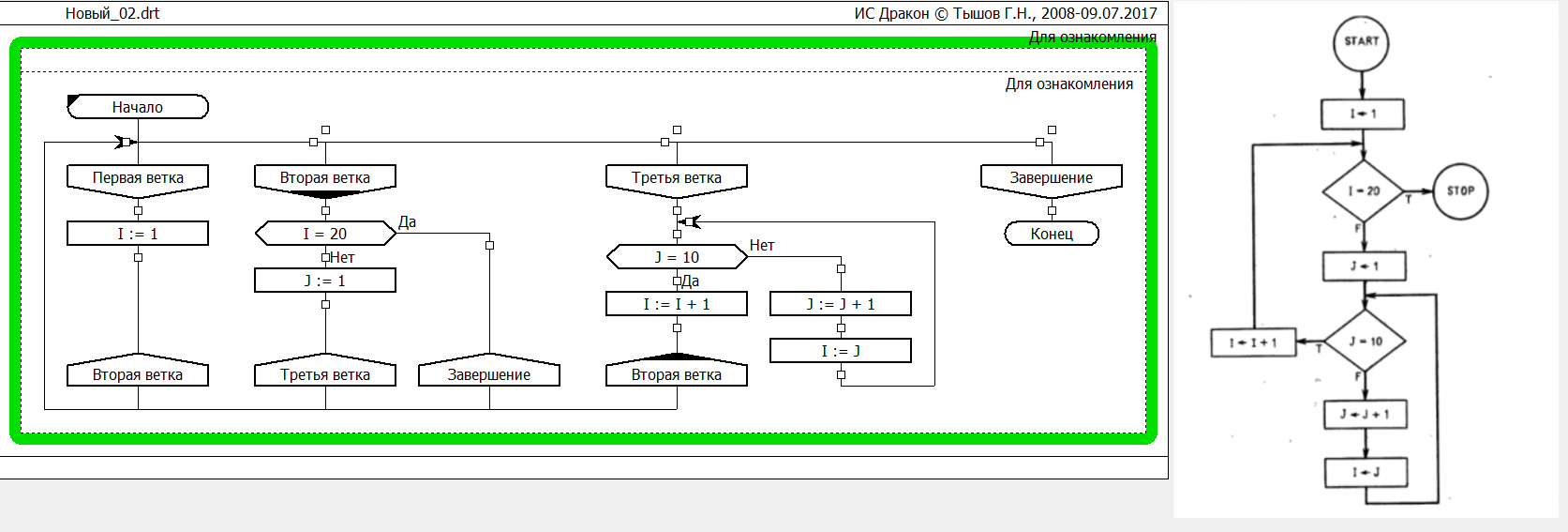 Справа от дракон-схемы блок-схема, по которой сделана дракон-схема, чтобы было проще сравнивать.
