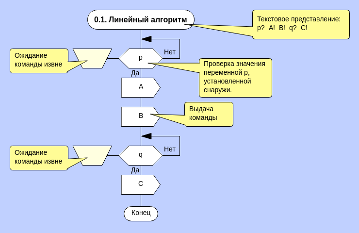 в) Если "ожидание" допустимо только у икон с одной веткой, смотрящей вниз (например, допустимо у "цикла со стрелкой" или у развилки, у которой одна из стрелок возвращается вверх, но недопустимо у развилки, у которой оба продолжения смотрят вниз), то можно договориться, что в случае "превышения времени ожидания", управление всегда проваливается вниз, где можно проверить "дождались-не дождались".