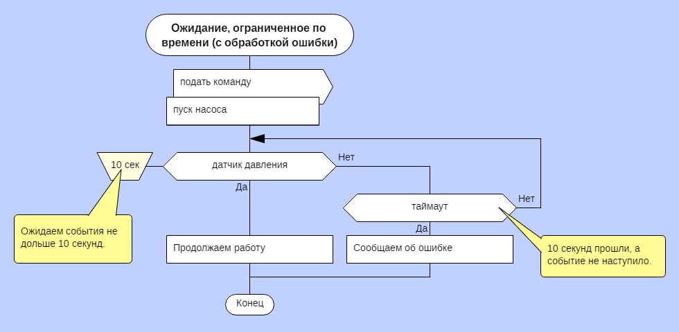 Например, "подали команду на пуск насоса и ждем срабатывание датчика давления" (см №25-26). По-хорошему, ждать нужно не бесконечно, а какое-то ограниченное время.
