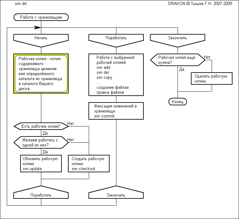 Вот чем хороша визуализация, так это обозримостью. Чтобы понять принципы работы SVN, надо внимательно прочитать неслабую документацию и построить схему в голове. Чтобы там критики ни говорили, а пока текст до конца не прочтёшь, схему в башке не построишь. Блок-схема, как таковая, мгновенно показывает границы - отчего становится легче на душе, а дракон-схема усиливает натиск и показывает "градиент важности" наблюдаемых процессов.