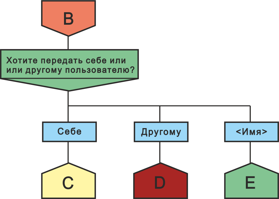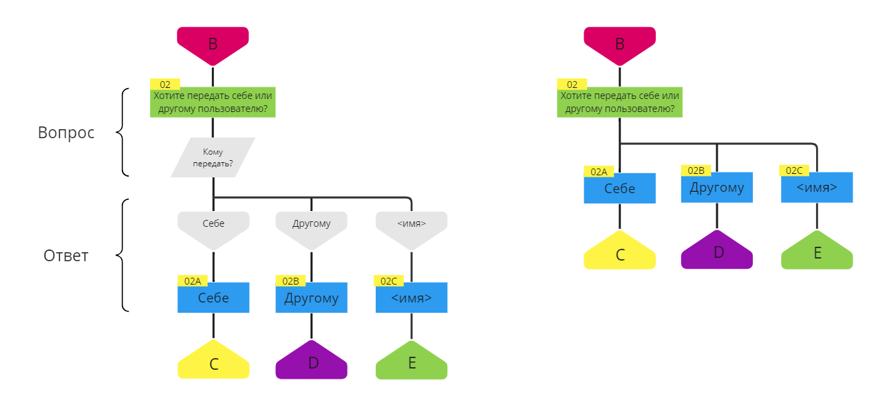 В этом случае можно было бы использовать икону «Выбор» с вопросом «Что ответил пользователь?», но это привело бы к созданию ряда одинаковых икон и визуальному усложнению схемы. Поэтому мы решили обойтись без них. Это также соответствует тому, как мы ведем разработку ботов, т.к. для реализации подобной логики не используются условные операторы.