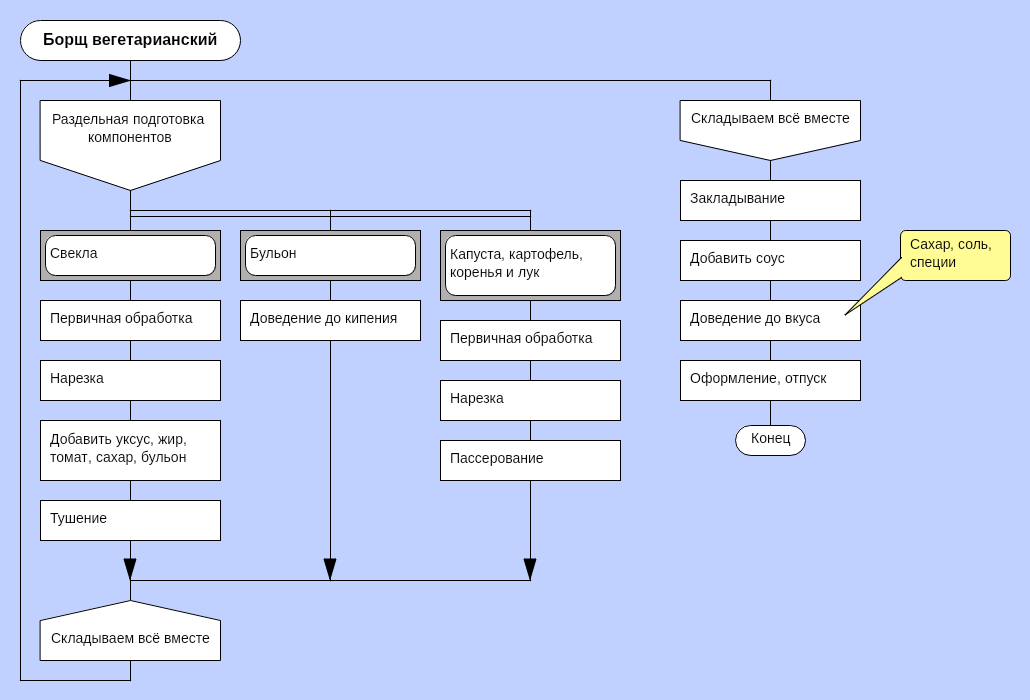 Соответственно, можно добавить две ветки к параллельному оператору: капуста и картофель, их нужно обработать первично и нарезать.