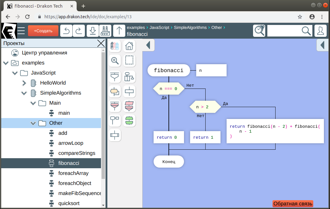 Поддерживается гибридный язык ДРАКОН-JavaScript.