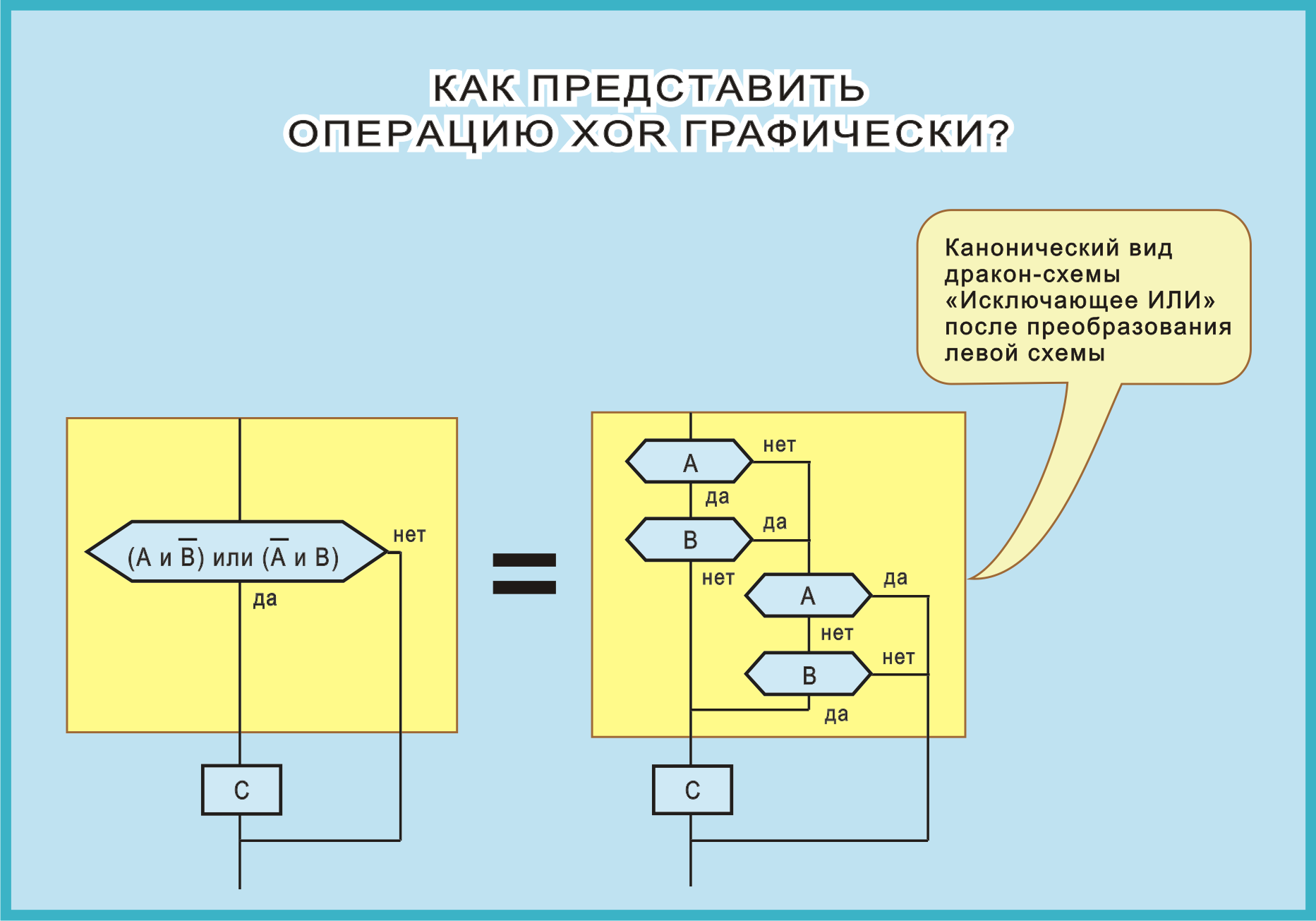 Другими словами, "a XOR b" тождественно "a <> b". XOR - это проверка на неравенство двух булевых значений. Неужели для этого нужна такая сложная Дракон-схема?