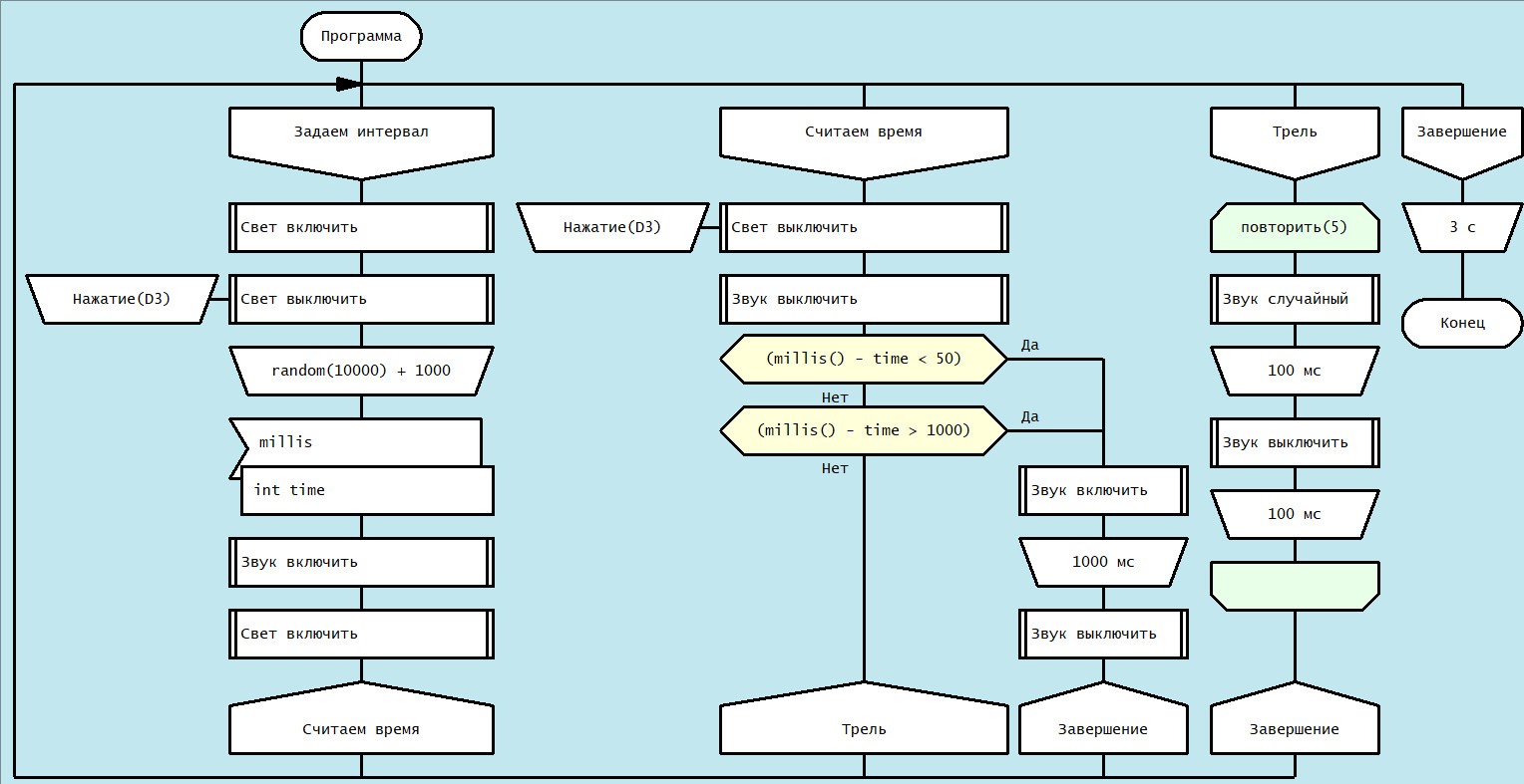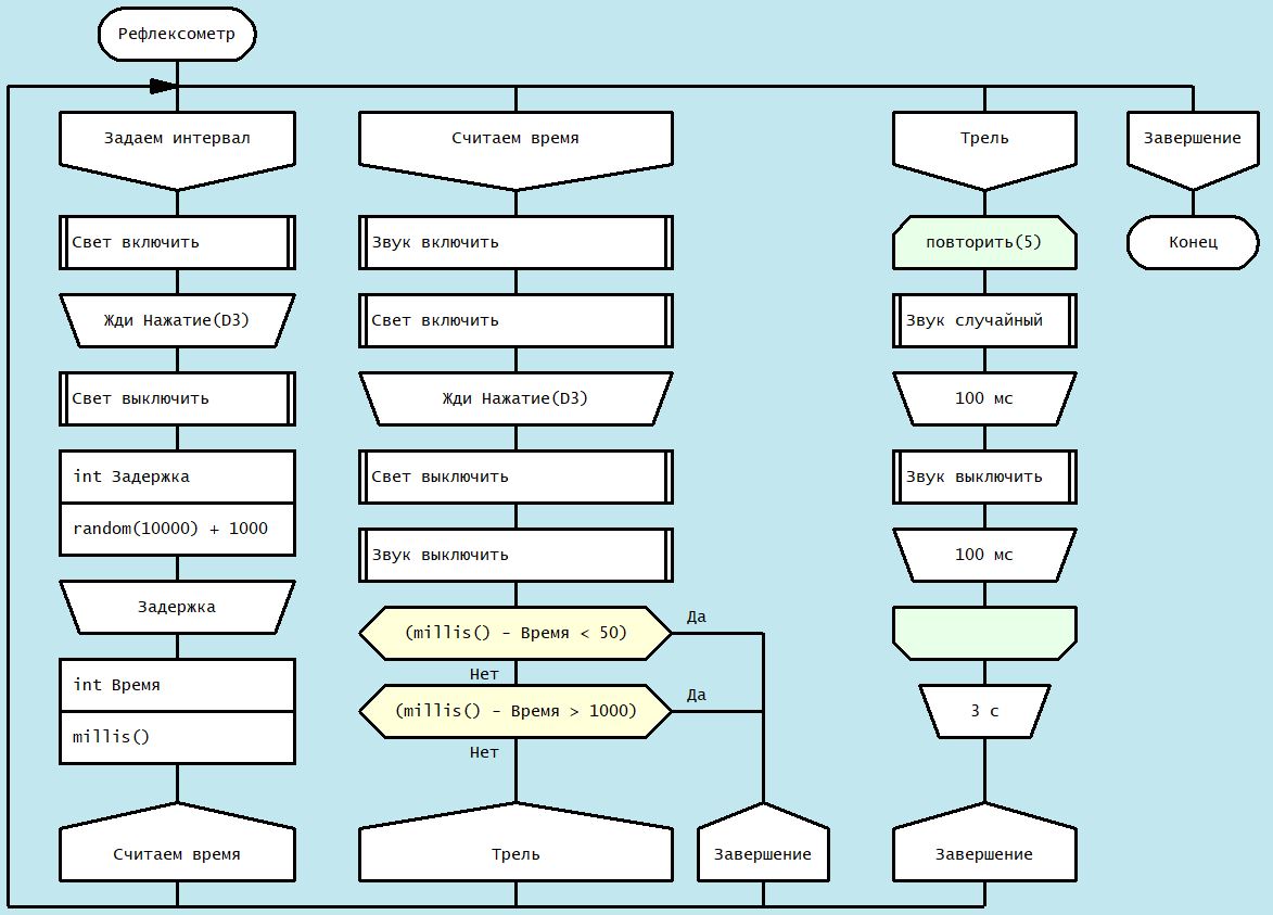 определяет время паузы до светового и звукового сигналов. После подачи сигналов фиксируется время начала отсчета, для чего используется функция millis(), возвращающая количество миллисекунд с начала работы МК. Повторное нажатие на кнопку выключает сигналы, и программа оценивает число миллисекунд, прошедших между началом отсчета и нажатием на кнопку. Если время реакции слишком мало (ошибка, dT<50 мс), или слишком велико (заторможенность, dT>1000 мс), устройство завершает работу. В противном случае подается звуковой сигнал, состоящий из серии пяти звуков разной частоты.
