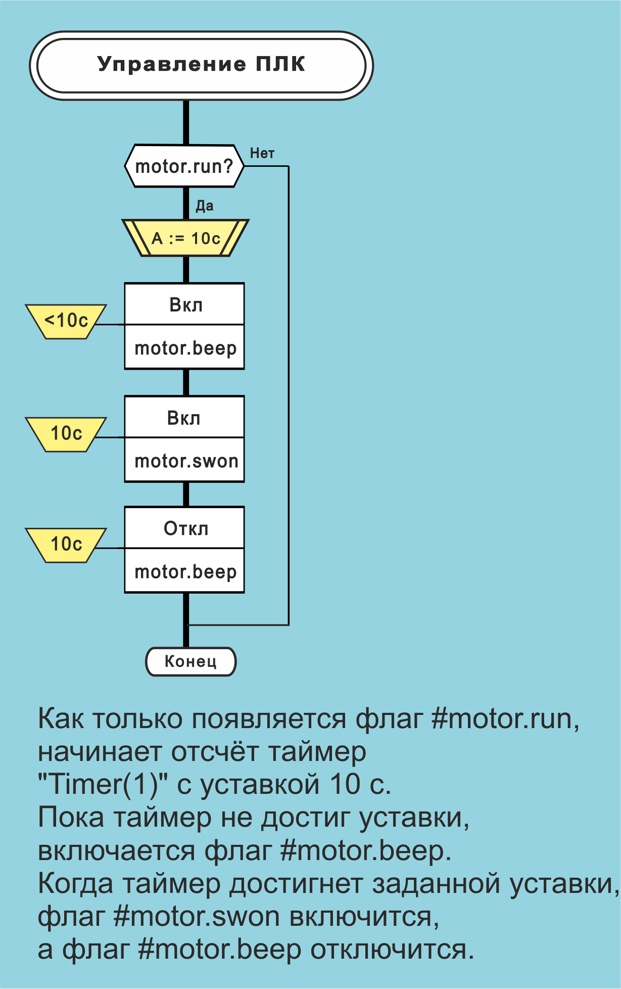 Как только появляется флаг #motor.run, начинает отсчёт таймер "Timer(1)" с уставкой 10 с.
