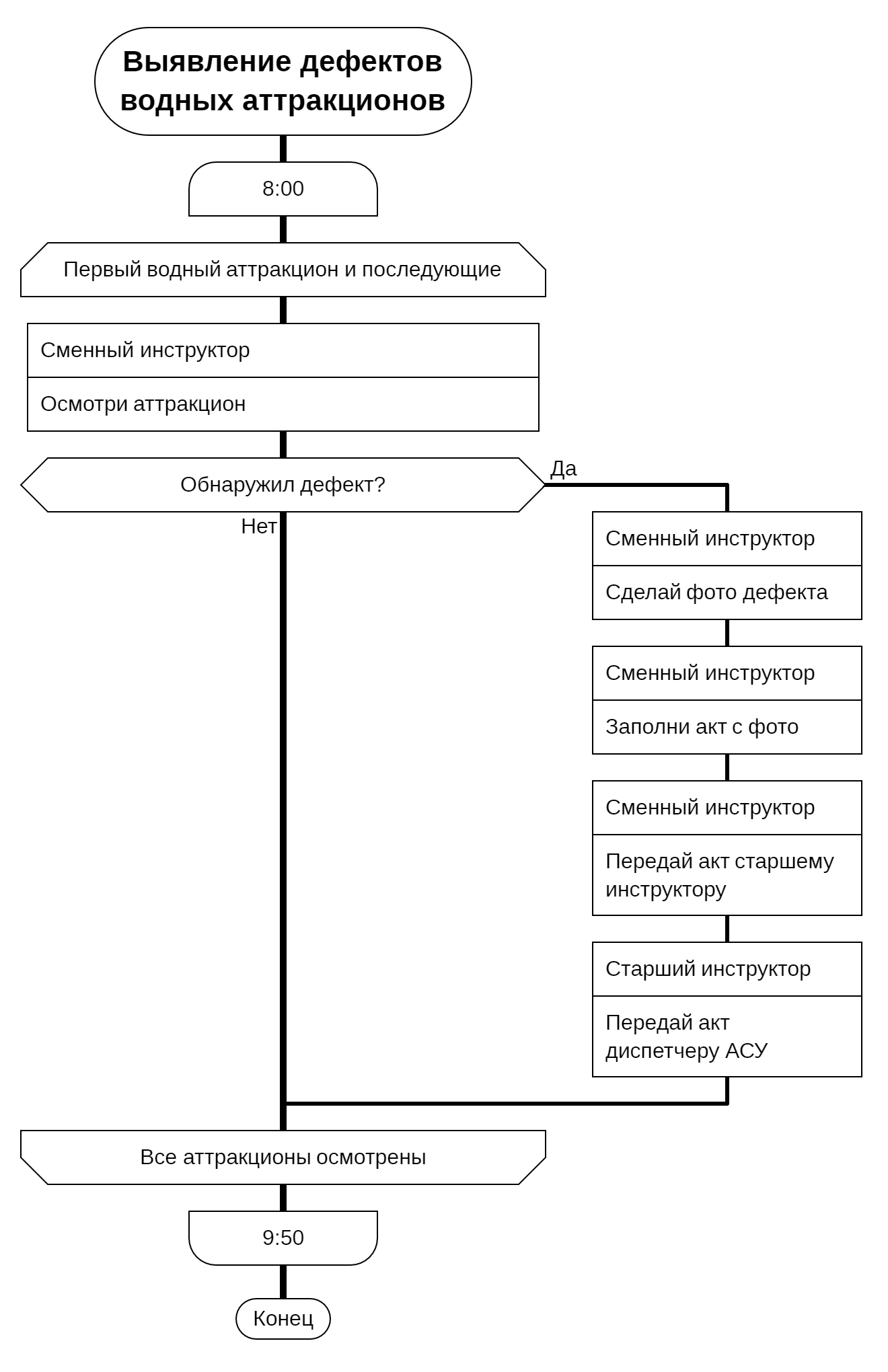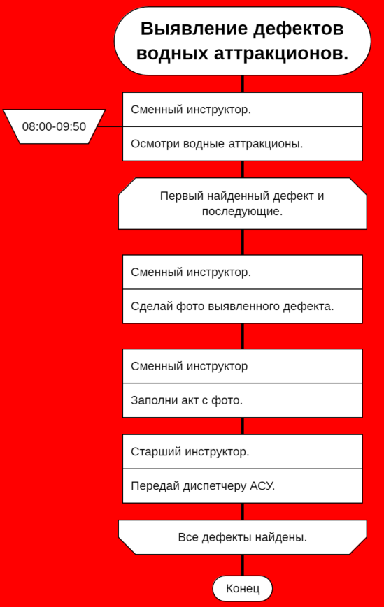 - С 8:00 до 9:50 сменный инструктор проводит осмотр. Если вдруг у аттракционов много дефектов, как он их все запомнит? Решение 1 – снабдить сменного инструктора ручкой и блокнотом, решение 2 – выполнять процедуру обработки выявленного дефекта сразу же, на месте. Я выбрал второе решение для своего варианта дракон-схемы, чтобы не заставлять инструктора второй раз посещать аттракцион, чтобы сфотографировать дефект.