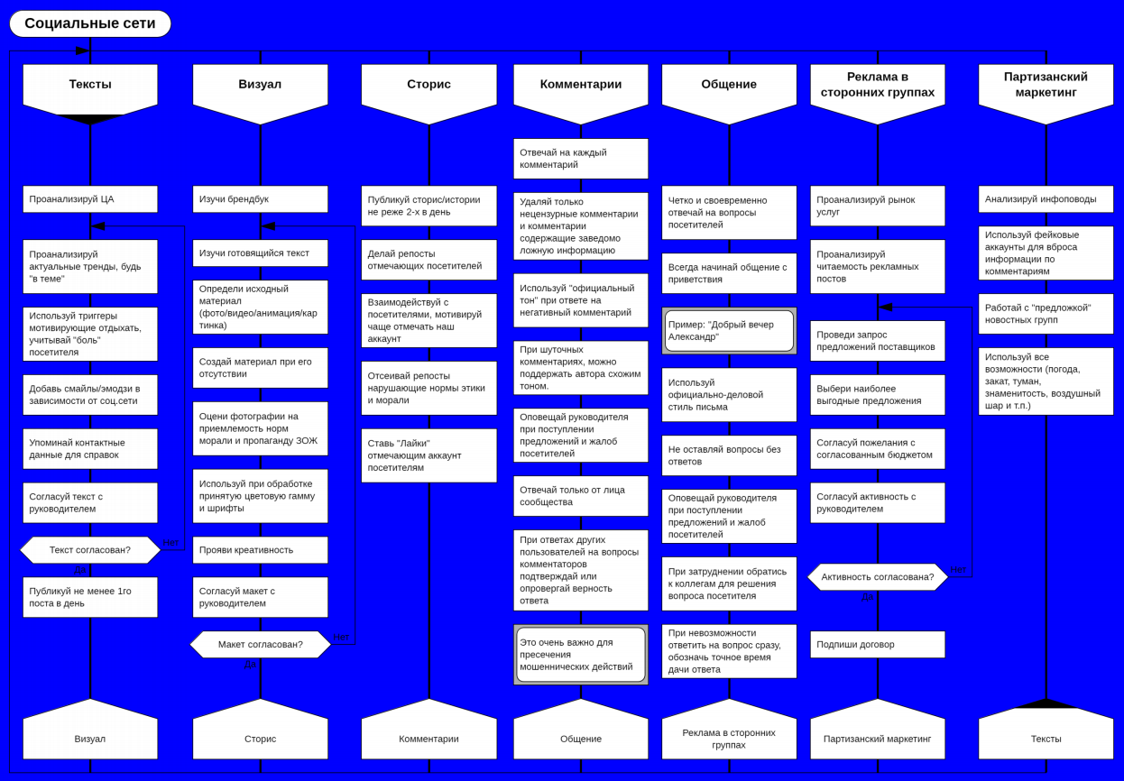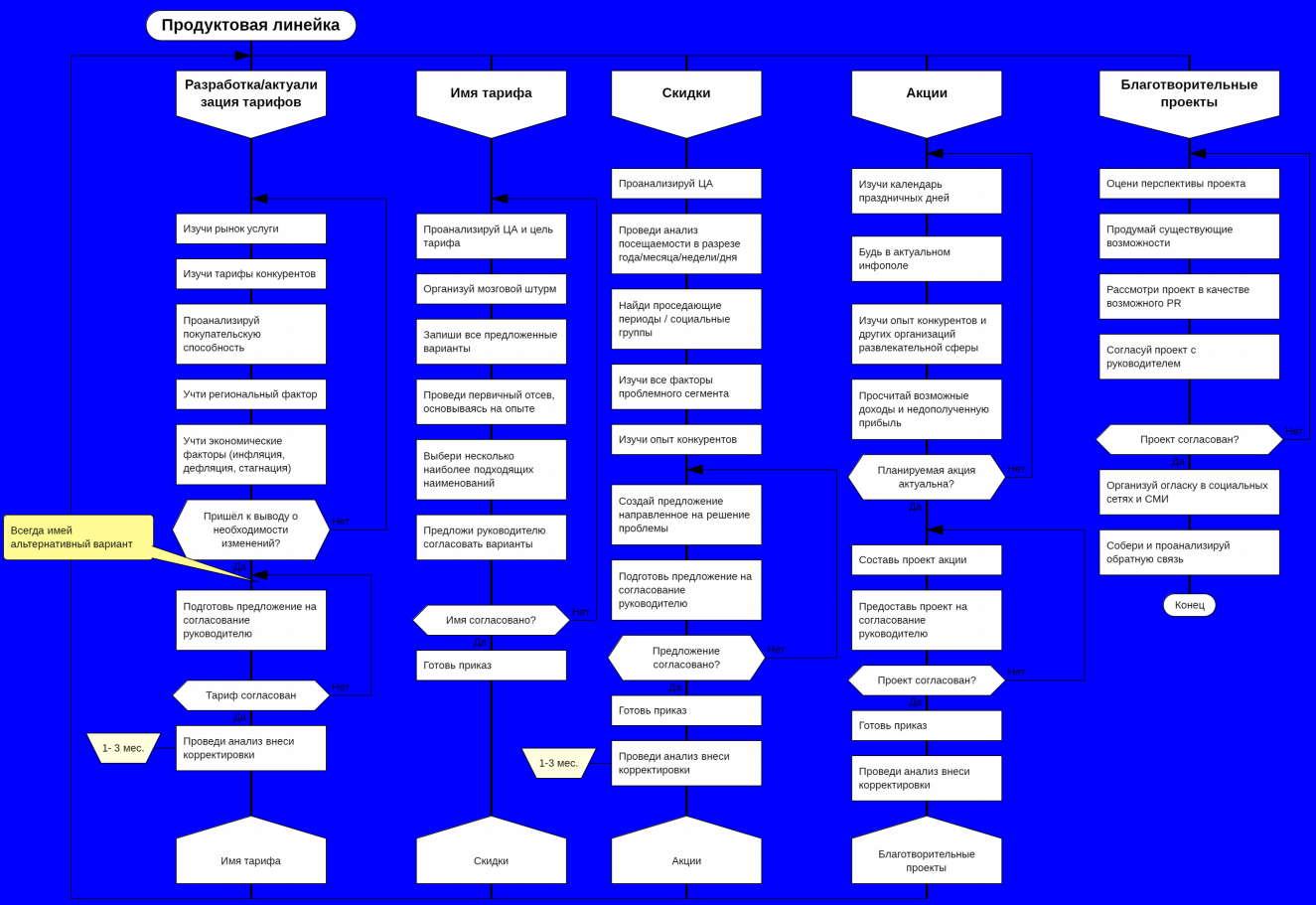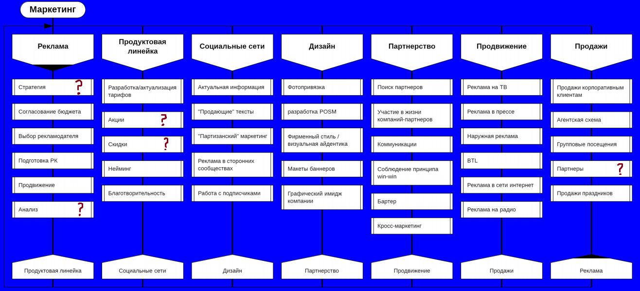 Мне было бы интересно узнать, кто был ответственным в алгоритмах взаимодействия. У каждого отдела был свой руководитель, а здесь его не написали. Но идея выше всяких похвал – очень важно увидеть связь отделов между собой в решении проблем.