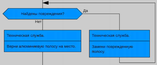 - Чтобы технической службе не пришлось выполнять операцию сложностью N, рекомендую заменить цикл развилкой, а Действие в теле развилки дополнить словом «целой» («замени повреждённую полосу целой»).