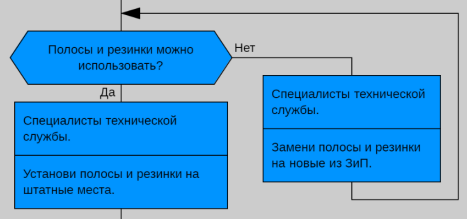 - Замена полос и резинок действительно происходит на новые. Но при этом пользователь снова должен проверять их качество. Специалисты технической службы недоверчивы, а это качество в алгоритме лучше отразить заменой цикла на развилку.